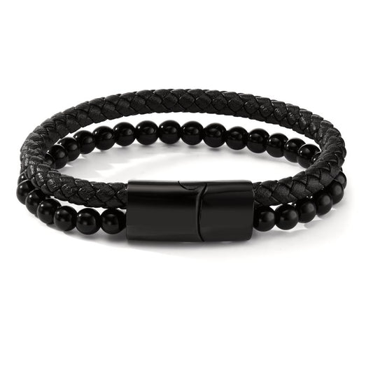 Armband Edelstahl, Leder synth. Stein schwarz IP beschichtet