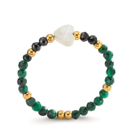 Fingerring Edelstahl Malachit grün, 2 mm, Spinell schwarz, 4 Steine, 2 mm Perlmutt Herz