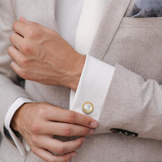 Manschettenknöpfe Edelstahl gelb IP beschichtet Perlmutt, 2 Perlen Ø15 mm