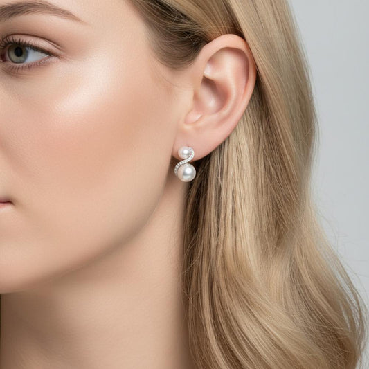 Pendant d'oreilles Argent Zircone 2 Pierres Rhodié perle d'eau douce, 2 Perles, 8 mm