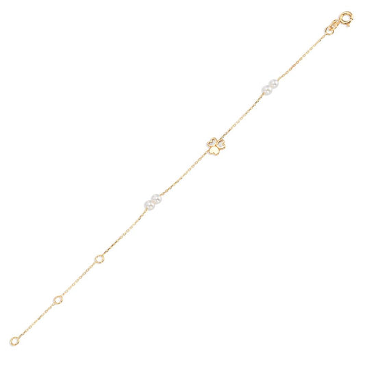Bracelet Or jaune 14K perle d'eau douce, 4 Perles 3-3.5 mm Feuille de Trèfle 12-16 cm