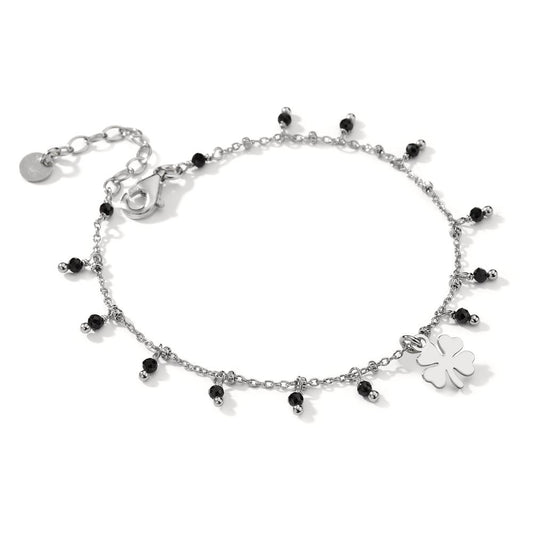 Bracelet Argent Cristal noir, 14 Pierres Rhodié Feuille de Trèfle