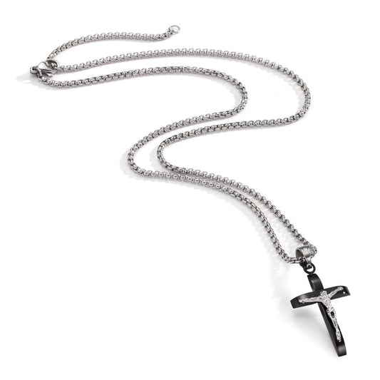 Collier Acier inoxydable, Carbone Zircone noir Croix 45-50 cm