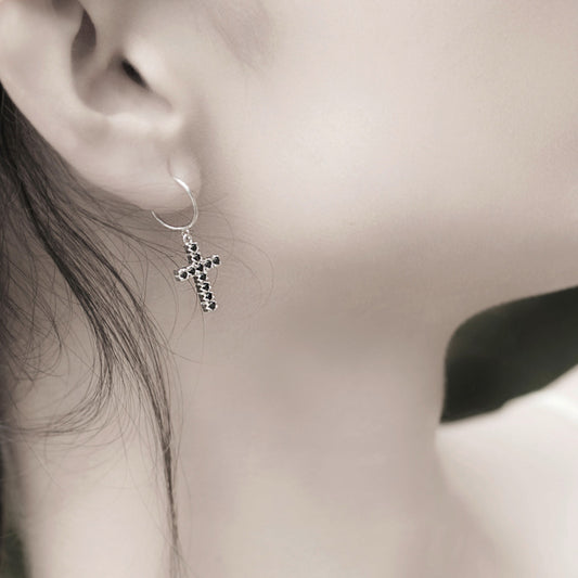 Orecchino a cerchio con pendente Oro bianco 750/18 carati Zirconia nero, 11 pietra Croce
