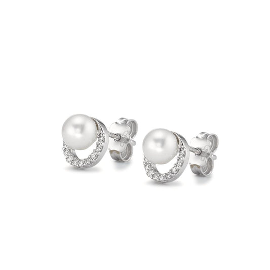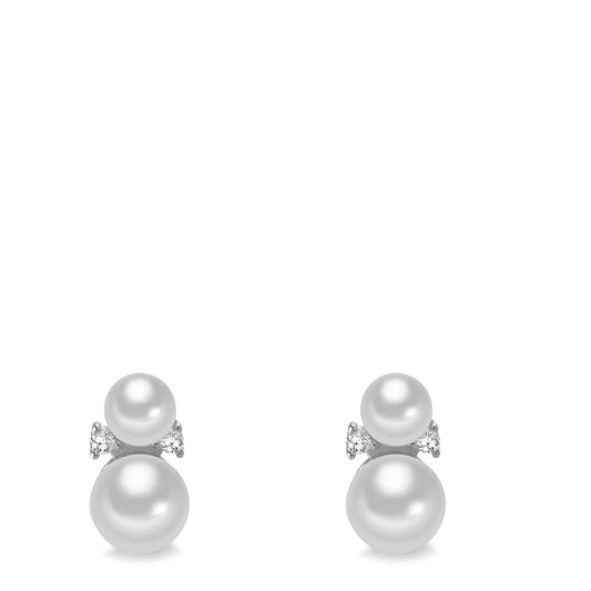Orecchini a bottone Oro bianco 750/18 carati Zirconia Perla coltivata d'acqua dolce bianco, 2 Perla, 5 mm Ø7.5 mm
