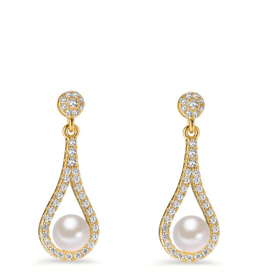 Orecchini a bottone Oro giallo 375/9K Zirconia 6 pietra Perla coltivata d'acqua dolce bianco, 2 Perla, 5.5 mm Ø9.5 mm