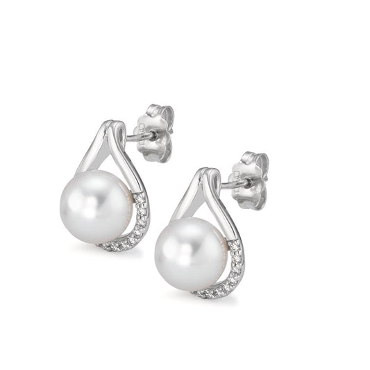 Orecchini a bottone Oro bianco 750/18 carati Zirconia 26 pietra Perla coltivata d'acqua dolce bianco, 2 Perla, 7.5 mm
