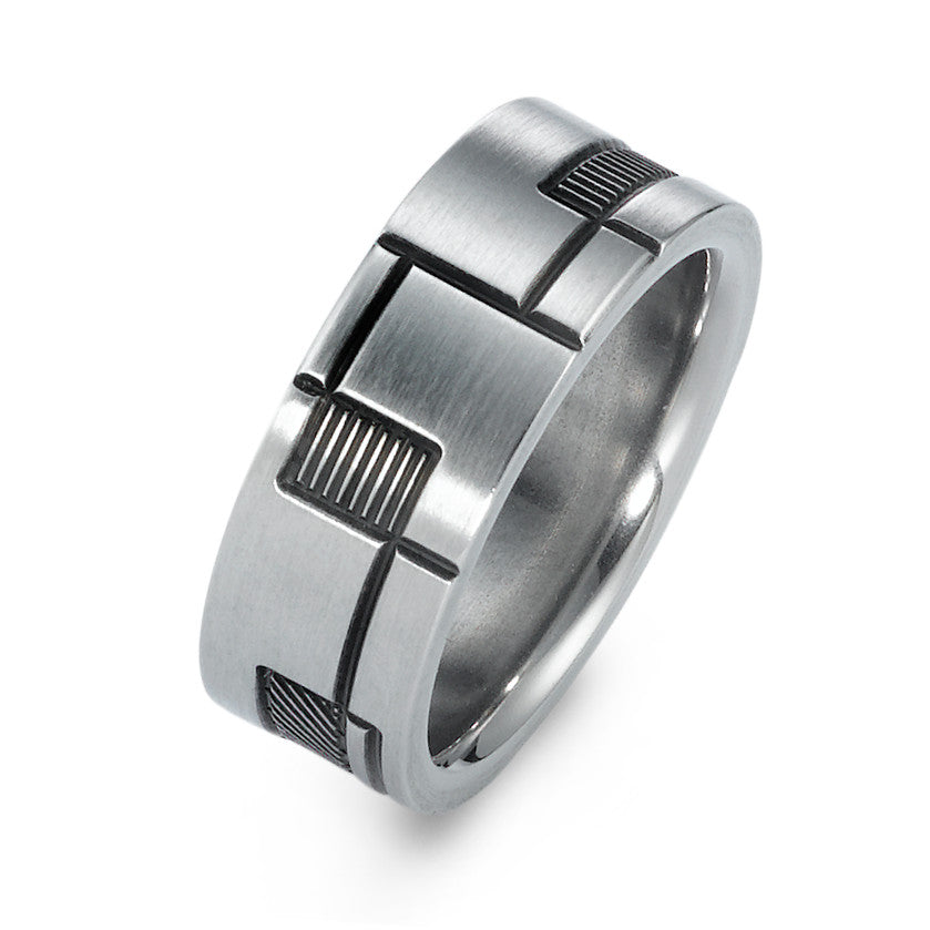 Anello da uomo in acciaio inossidabile, dal design moderno e raffinato. La superficie satinata è arricchita da dettagli incisi che donano carattere e stile. Un accessorio resistente e versatile, perfetto per ogni occasione. Comfort e durata garantiti nel tempo.