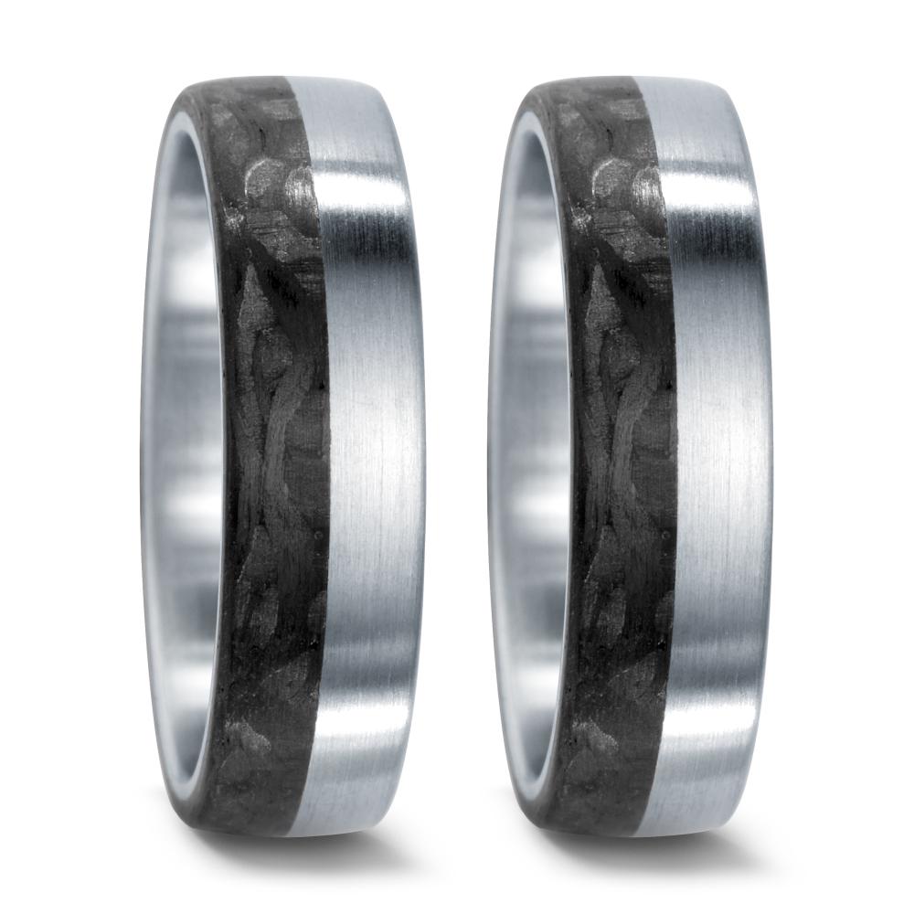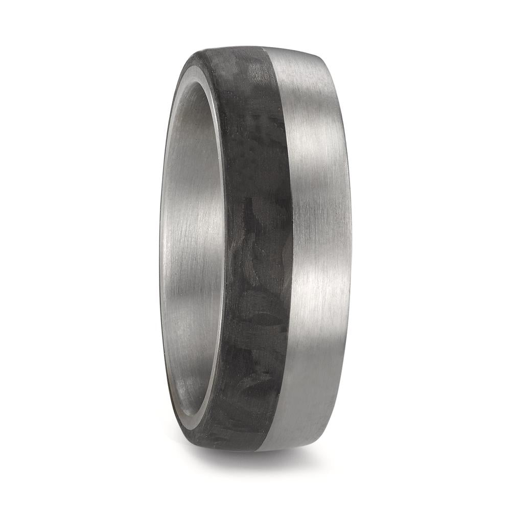 Anello da uomo elegante realizzato in acciaio inossidabile con inserti in carbonio nero. Design moderno e robusto, ideale per coppie che cercano un simbolo di lunga durata e stile contemporaneo. Comfort e resistenza in un accessorio unico.