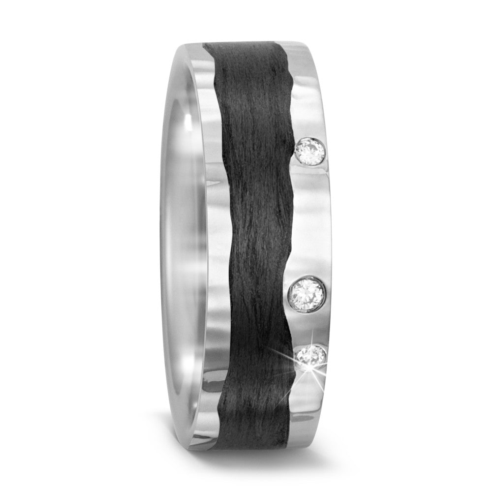 Anello da donna in oro bianco 585 con inserto in carbonio e tre diamanti scintillanti. Design elegante e contemporaneo, perfetto come fede nuziale o anello di coppia, combina resistenza e raffinatezza per un simbolo d'amore unico e duraturo.
