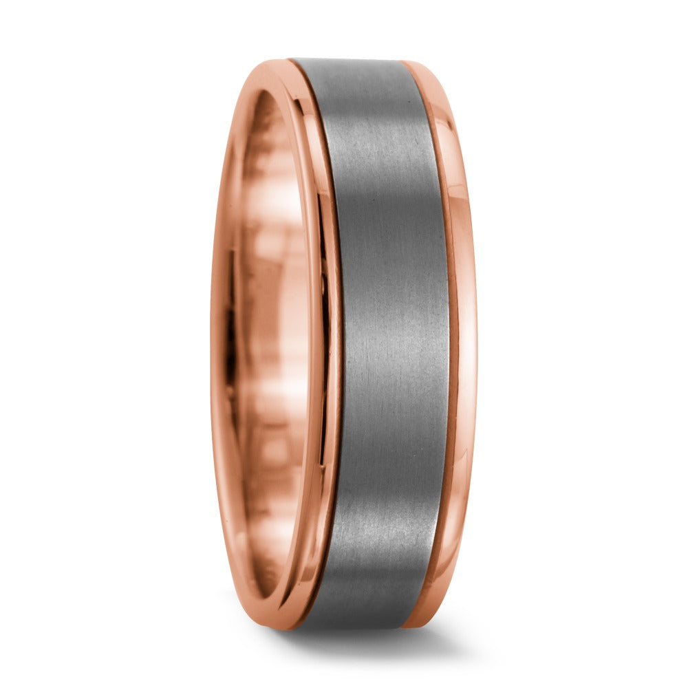 Anello da coppia elegante in titanio con dettagli raffinati in oro rosso 750. Design moderno e resistente, perfetto per celebrare un legame speciale con stile e durata nel tempo. Una scelta sofisticata per chi cerca originalità e qualità.
