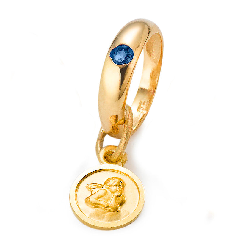 Delizioso anellino per battesimo in oro giallo 375, impreziosito da uno zaffiro blu e un ciondolo con angelo protettore. Un gioiello elegante e simbolico, perfetto per accompagnare i primi momenti importanti del tuo bambino con amore e stile.