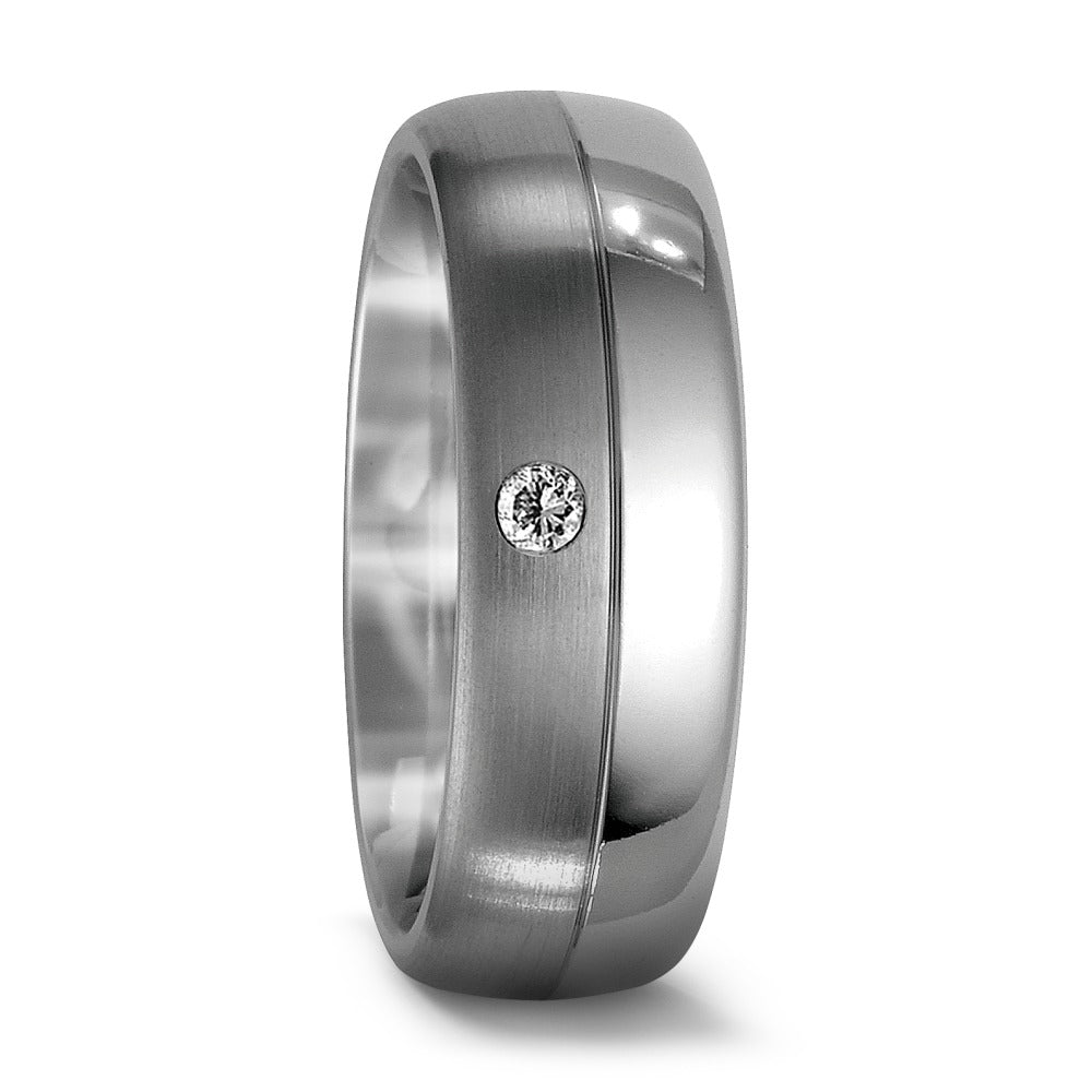 Anello da donna in titanio elegante e resistente, arricchito da un brillante zircone incastonato. Design moderno con finitura opaca e dettagli lucidi che rendono questo anello perfetto per ogni occasione, combinando stile e comfort in un solo gioiello.