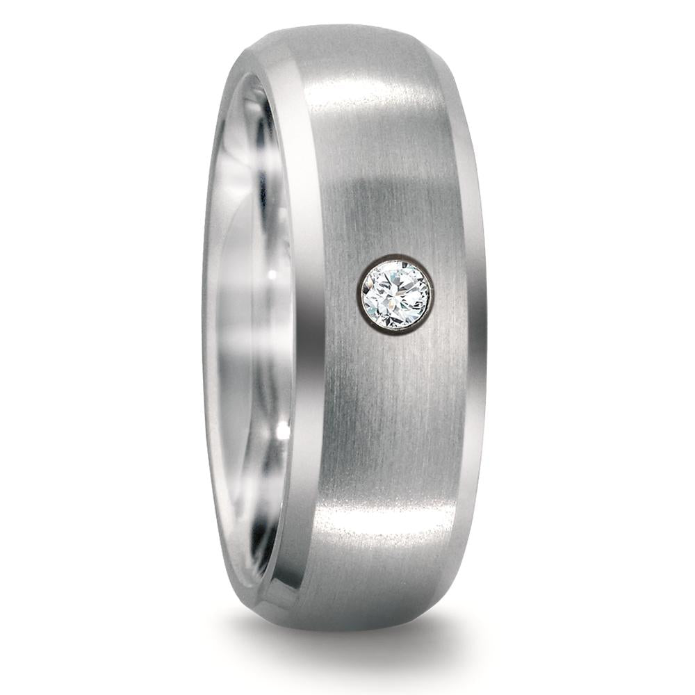 Elegante anello da donna in titanio, caratterizzato da una finitura satinata e impreziosito da un brillante zircone incastonato al centro. Resistente, leggero e moderno, un accessorio perfetto per ogni occasione, che unisce stile e comfort con raffinatezza.