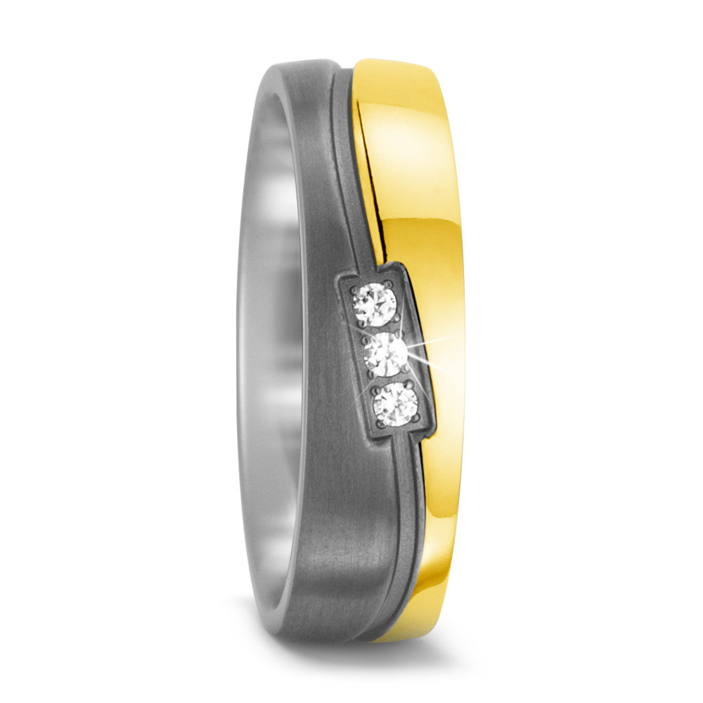 Elegante anello da donna in titanio, arricchito con tre scintillanti zirconi. Il design moderno unisce finiture opache e lucide con un accento dorato, per un tocco di raffinata luminosità. Perfetto per chi cerca stile e comfort ogni giorno.