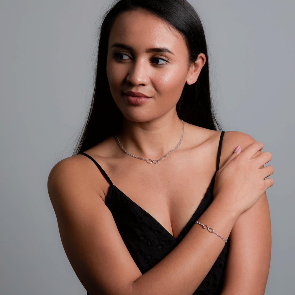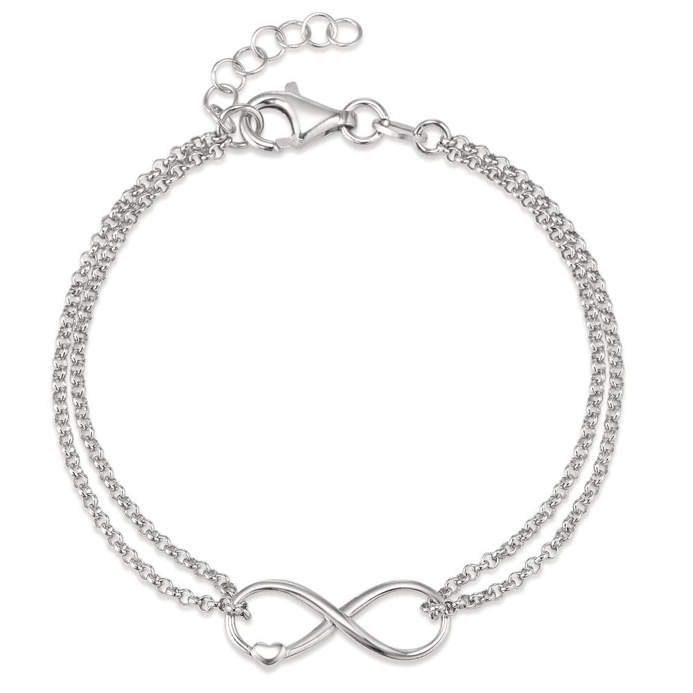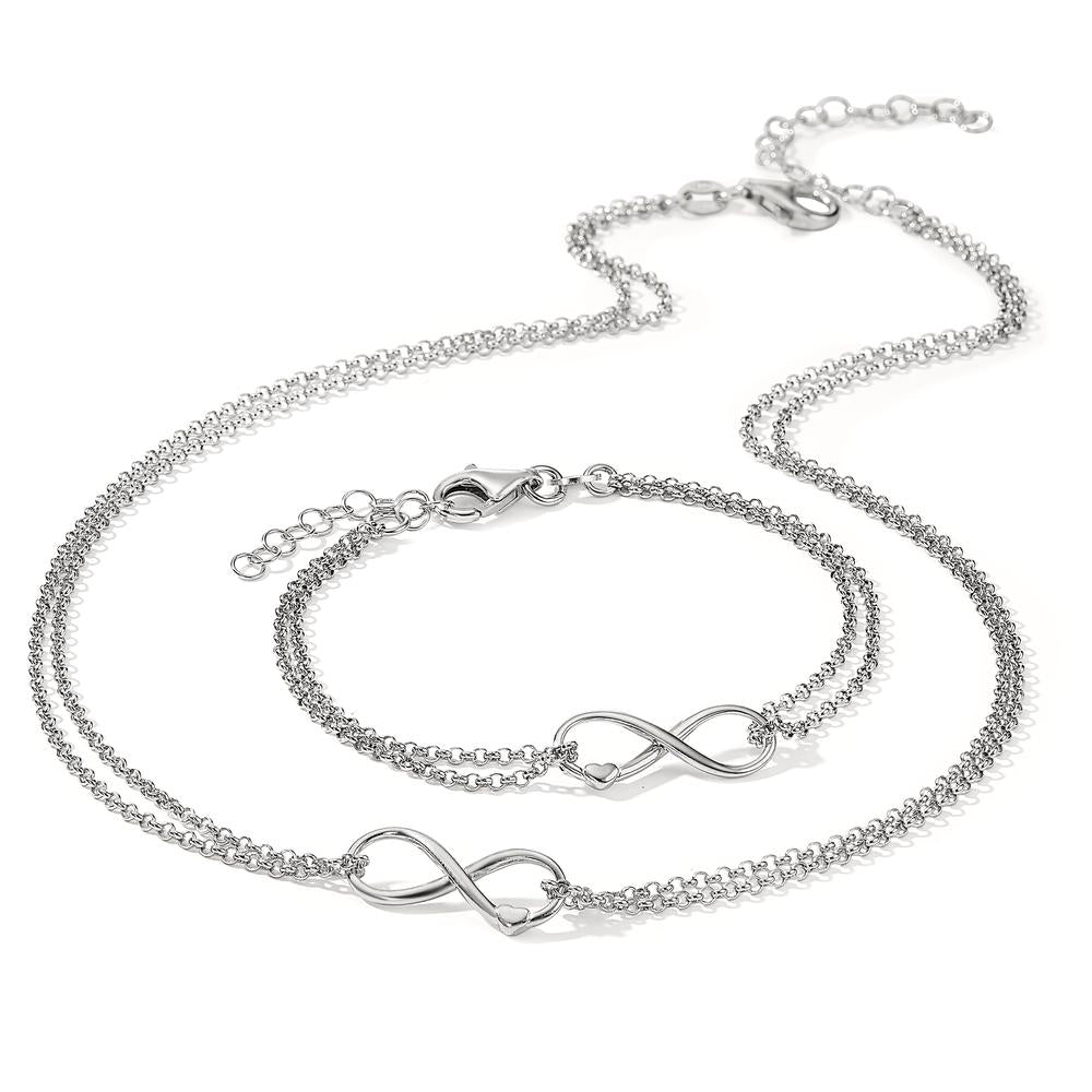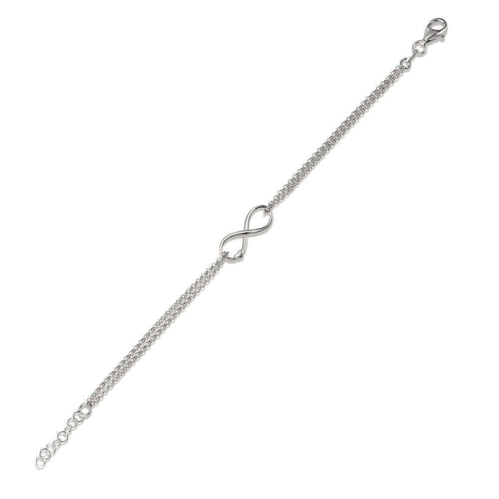 Bracciale da donna in argento con doppia catena e simbolo dell'infinito. Design elegante e raffinato, perfetto per ogni occasione. Il piccolo cuore aggiunge un tocco di dolcezza, rendendolo un regalo ideale per esprimere affetto eterno. Regolabile per adattarsi a ogni polso.