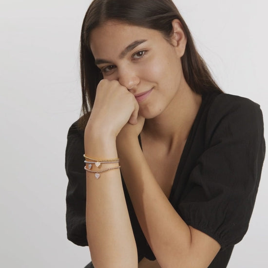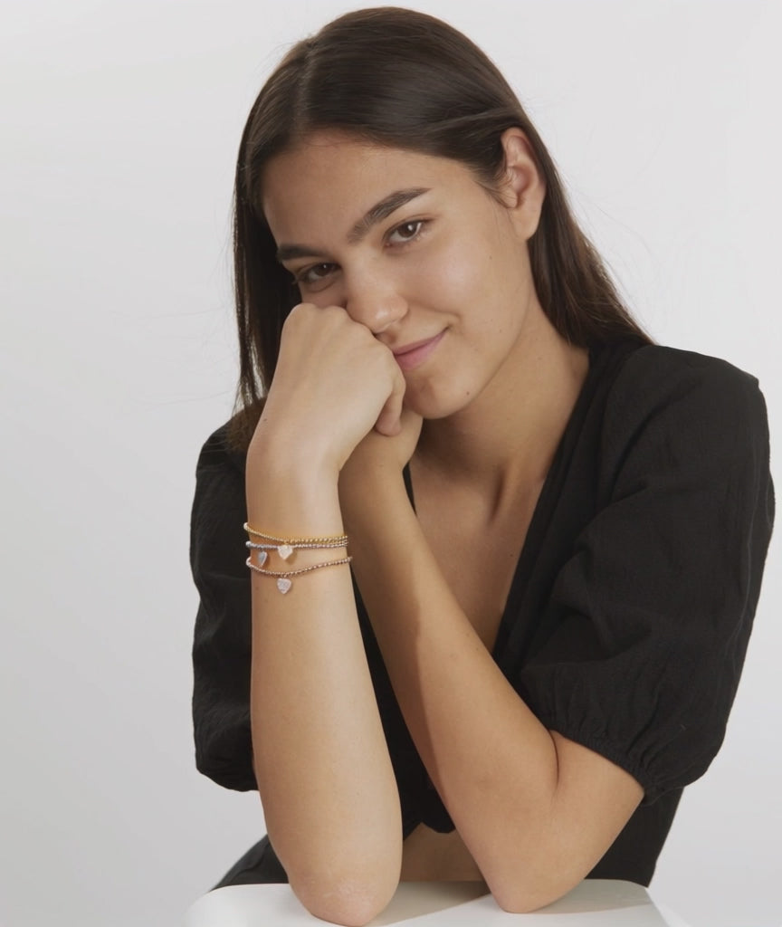 Bracciale da donna in argento con finitura rosa, decorato con perline lucide e pendente a forma di cuore impreziosito da zirconi scintillanti. Elegante e raffinato, è l'accessorio perfetto per aggiungere un tocco di femminilità e brillantezza a ogni look. Lunghezza regolabile.