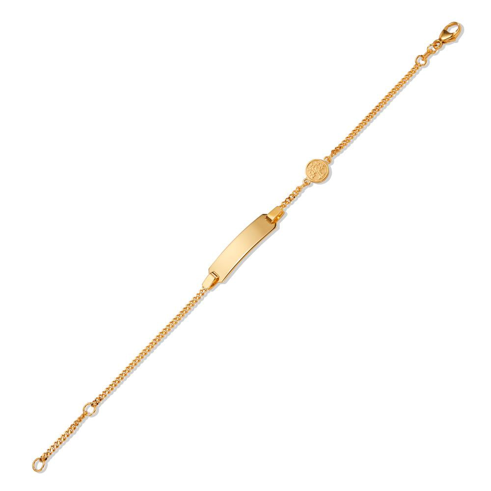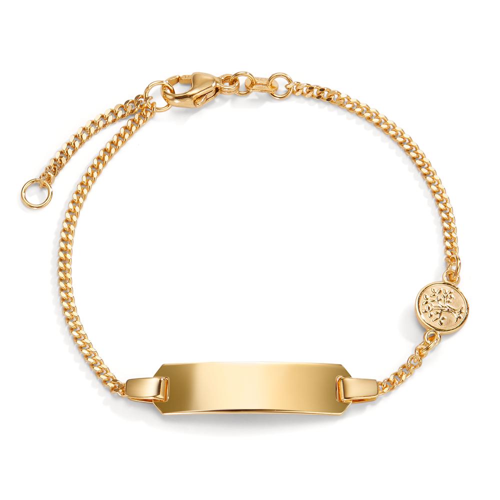 Braccialetto per bambini in oro giallo 375 con targhetta personalizzabile per incisione. Elegante e delicato, arricchito da un ciondolo con albero della vita, simbolo di crescita e protezione. Perfetto come regalo unico e prezioso per i più piccoli.