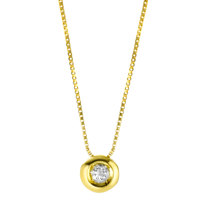 Collana da donna in oro giallo 750 raffinata, con brillante zircone incastonato al centro. Un gioiello elegante e luminoso, perfetto per donare un tocco di classe e raffinatezza ad ogni outfit, ideale per ogni occasione speciale.