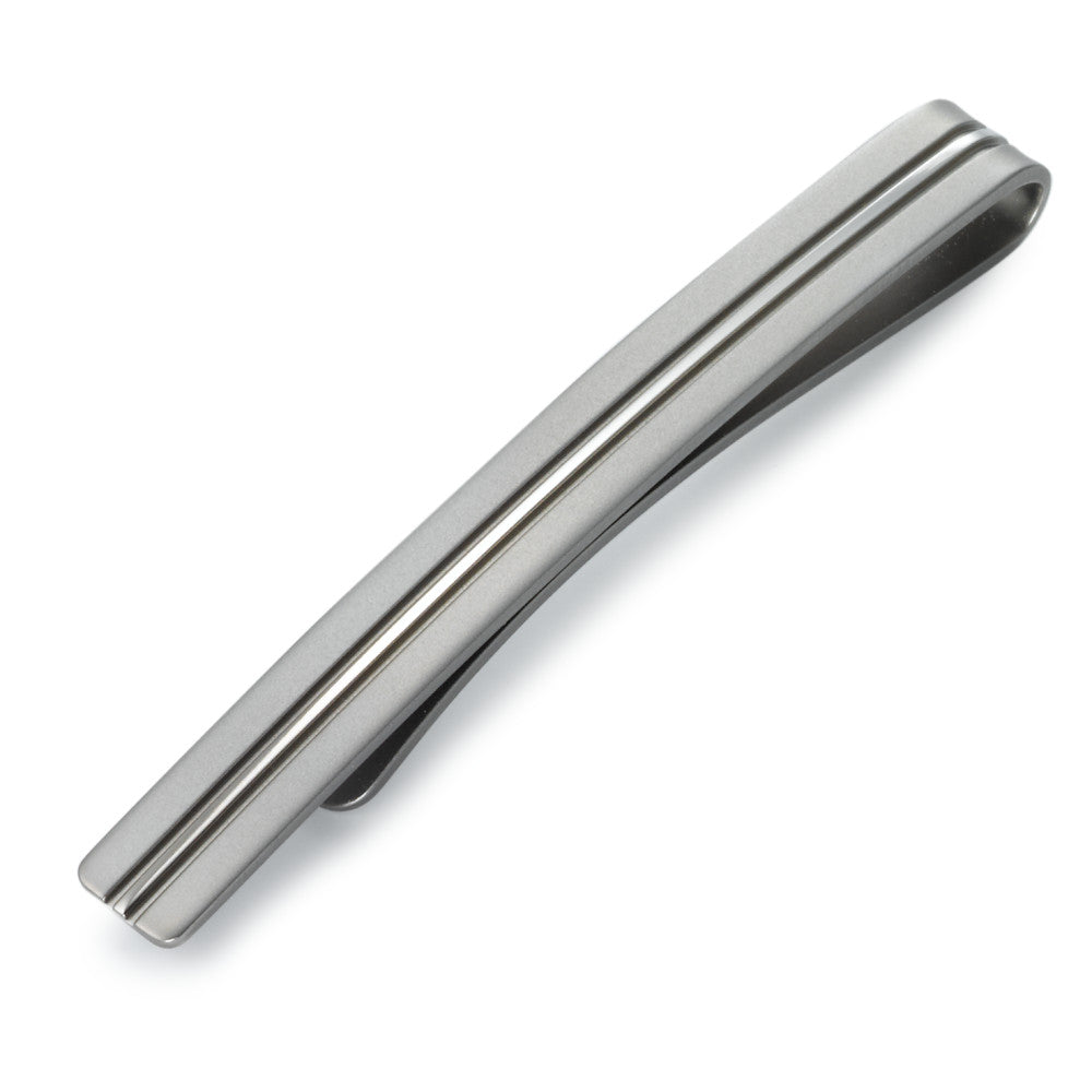 Fermacravatta da uomo in titanio, elegante e resistente. Design moderno con doppia linea centrale, perfetto per un tocco di stile discreto ma raffinato. Leggero e anallergico, ideale per ogni occasione, mantiene la cravatta in posizione con comodità e sicurezza.
