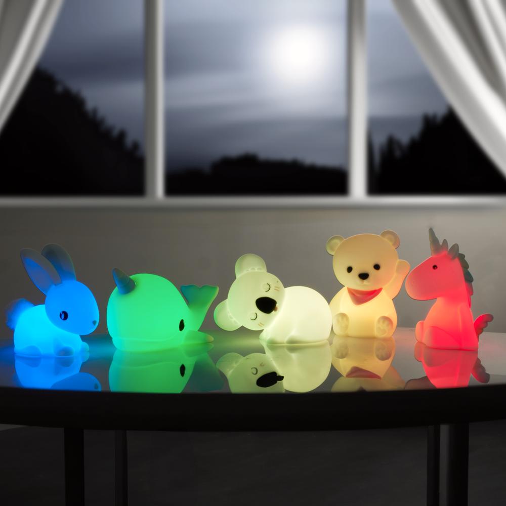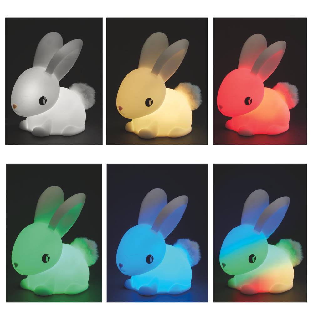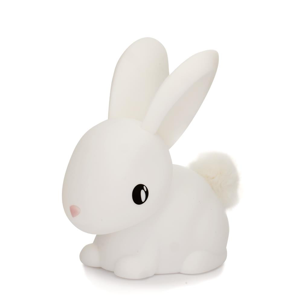 Lampada da tavolo per bambini a forma di coniglio bianco, dal design dolce e simpatico. Realizzata in materiale sicuro e morbido al tatto, perfetta per creare un'atmosfera accogliente nella cameretta dei più piccoli. Ideale come luce notturna decorativa.