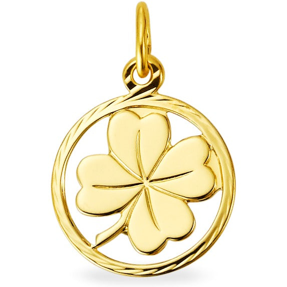 Dieser filigrane Anhänger aus 375er Gelbgold zeigt ein vierblättriges Kleeblatt als Symbol für Glück und Schutz. Das elegante Design im runden Rahmen macht ihn zum perfekten Accessoire für jeden Anlass – ein edles Geschenk für besondere Menschen.
