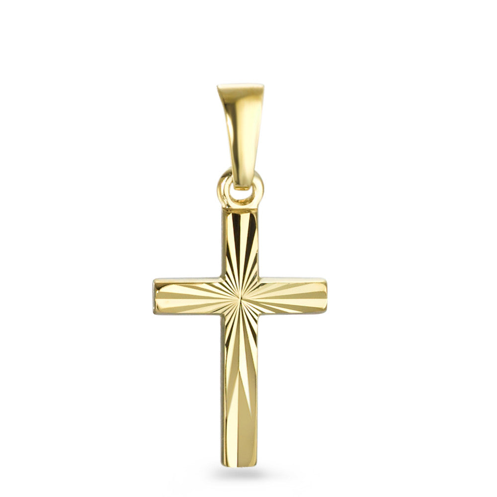 Edler Kreuz-Anhänger aus 375er Gelbgold mit fein strahlenförmiger Gravur. Klassisches Design, das zeitlose Eleganz versprüht und sich perfekt für jeden Anlass eignet. Ein stilvolles Schmuckstück, das Ihrem Look eine persönliche Note verleiht.