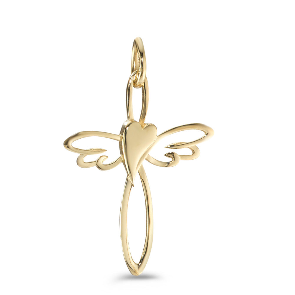 Eleganter Damen-Anhänger aus 375er Gelbgold in Kreuz-Form. Das filigrane Design wird von einem Herz mit Engelsflügeln verziert und verleiht jedem Outfit eine besondere Note. Perfektes Schmuckstück für besondere Anlässe oder als Geschenk mit symbolischem Wert.