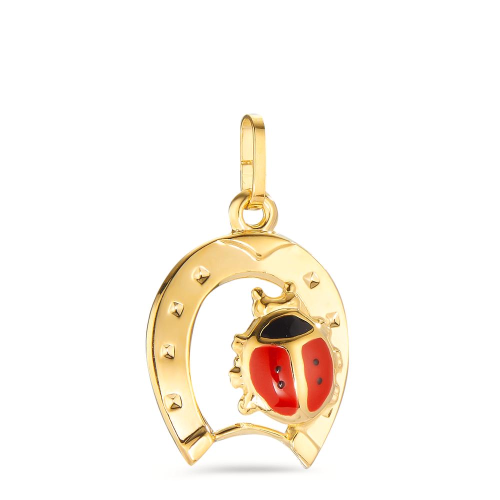 Zauberhafter Mädchen-Anhänger aus 375er Gelbgold in Form eines Hufeisens mit einem detailreich gestalteten, emaillierten Marienkäfer. Ein süsses Glückssymbol, das sich perfekt als Geschenk oder charmantes Accessoire eignet. Leicht und zeitlos schön!