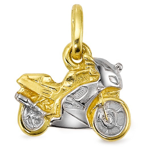 Stylischer Herren Anhänger in Form eines Motorrads aus hochwertigem 750er Gelbgold mit silberfarbenen Details. Ein perfektes Schmuckstück für Motorradliebhaber, das Eleganz und Leidenschaft vereint. Robust verarbeitet und ein Blickfang an jeder Kette.