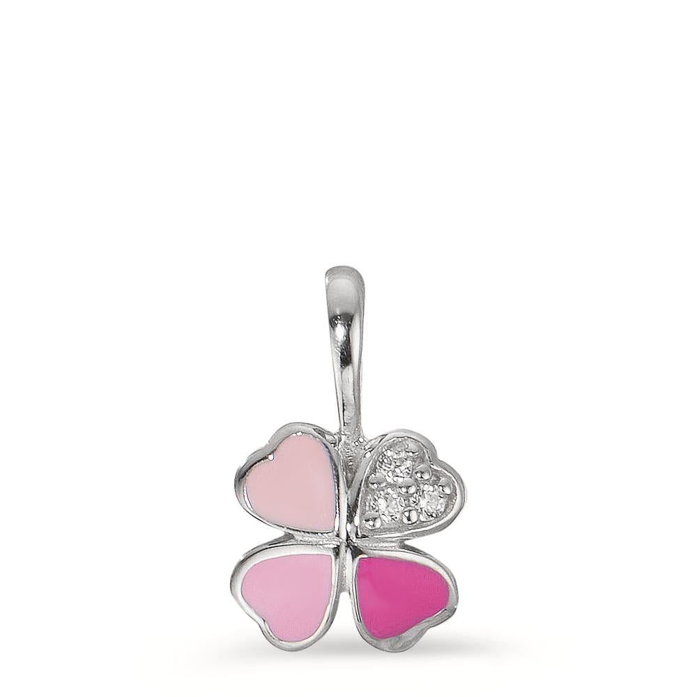 Zauberhafter Mädchen Anhänger aus hochwertigem Silber in Kleeblatt-Form. Drei Herzblätter sind in verschiedenen Rosa-Tönen glasiert, das vierte mit funkelnden Zirkonia besetzt. Das perfekte Accessoire für kleine Glücksbringer mit zartem Charme.