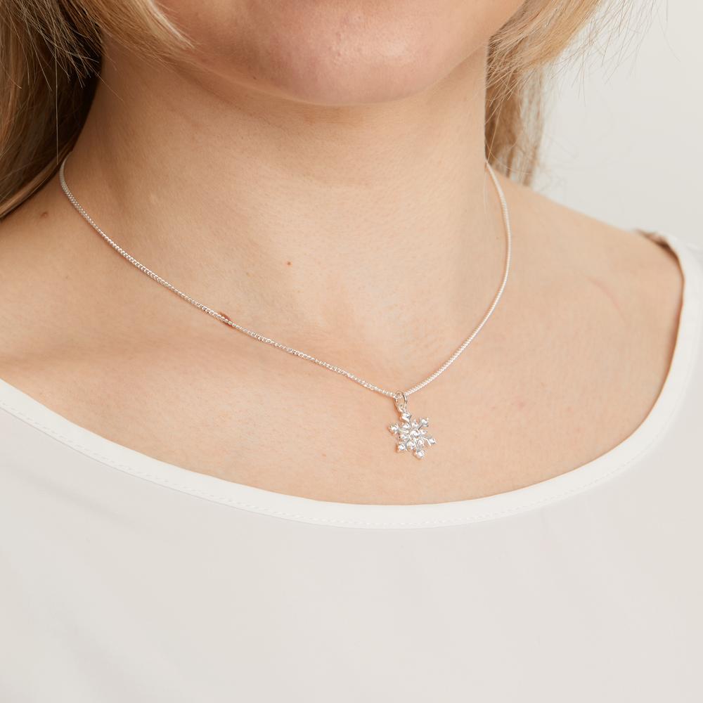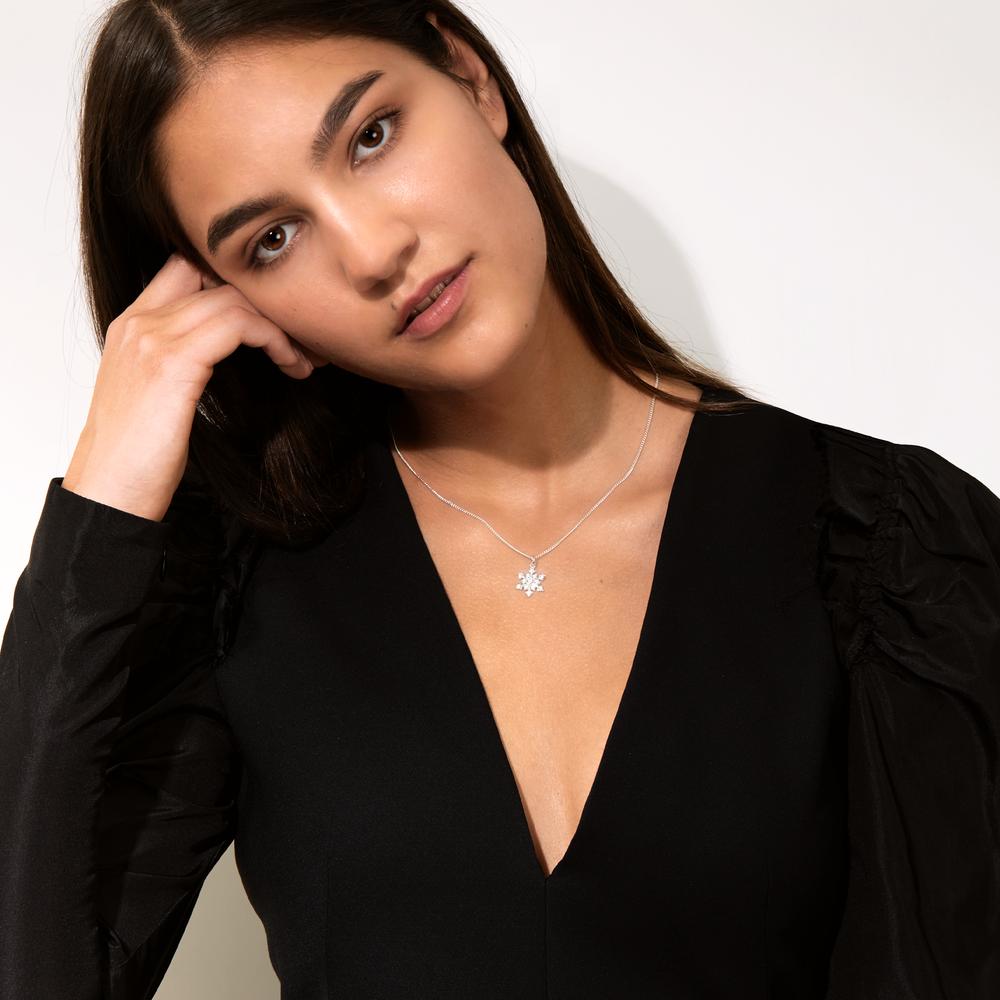 Eleganter Damenanhänger in Silber, bezaubernd gestaltet als funkelnde Schneeflocke. Verziert mit strahlenden Zirkonia-Steinen, die dem Schmuckstück einen glanzvollen Auftritt verleihen. Perfekt, um jedem Outfit einen Hauch von Winterzauber und Stil zu verleihen.