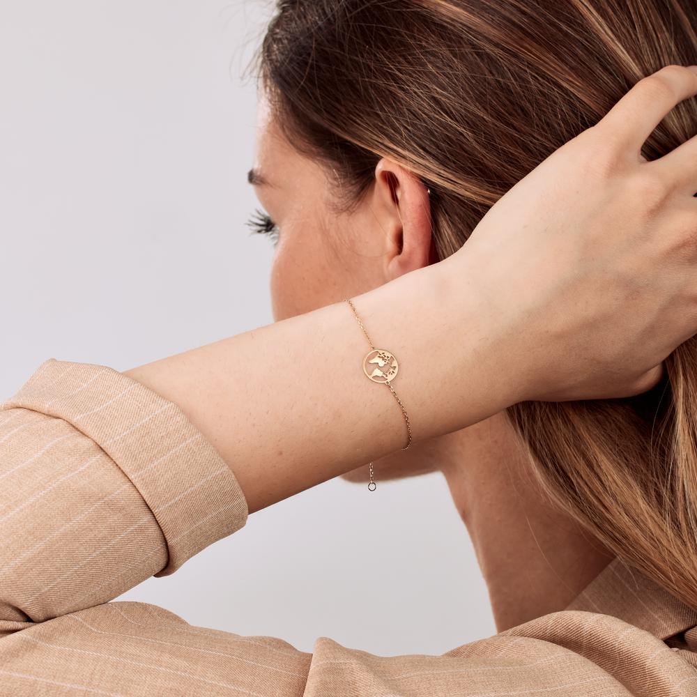 Feines Damen-Armband aus 375er Gelbgold mit filigranem Weltkugel-Anhänger. Ein elegantes Schmuckstück, das Ihre Liebe zur Welt stilvoll zum Ausdruck bringt. Perfekt für jeden Anlass und als Geschenk für Weltenbummlerinnen. Länge variabel durch Verlängerungskettchen.