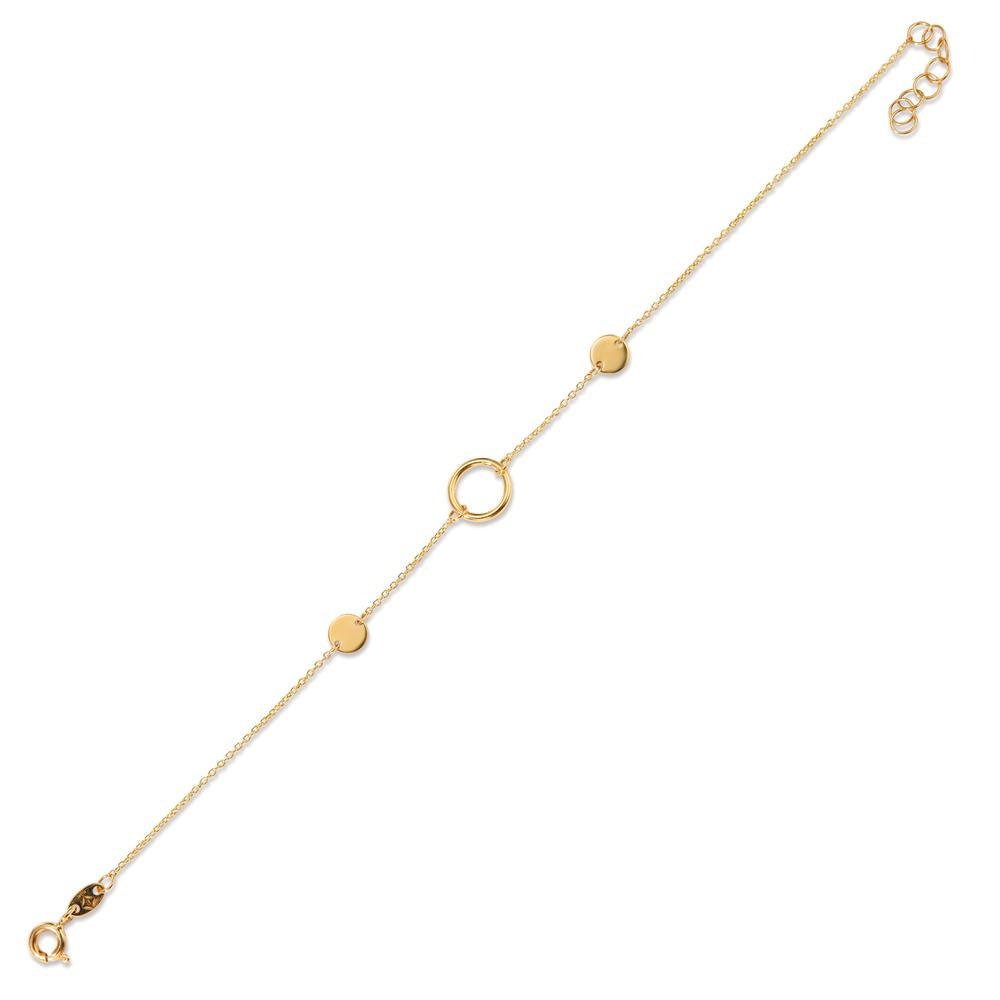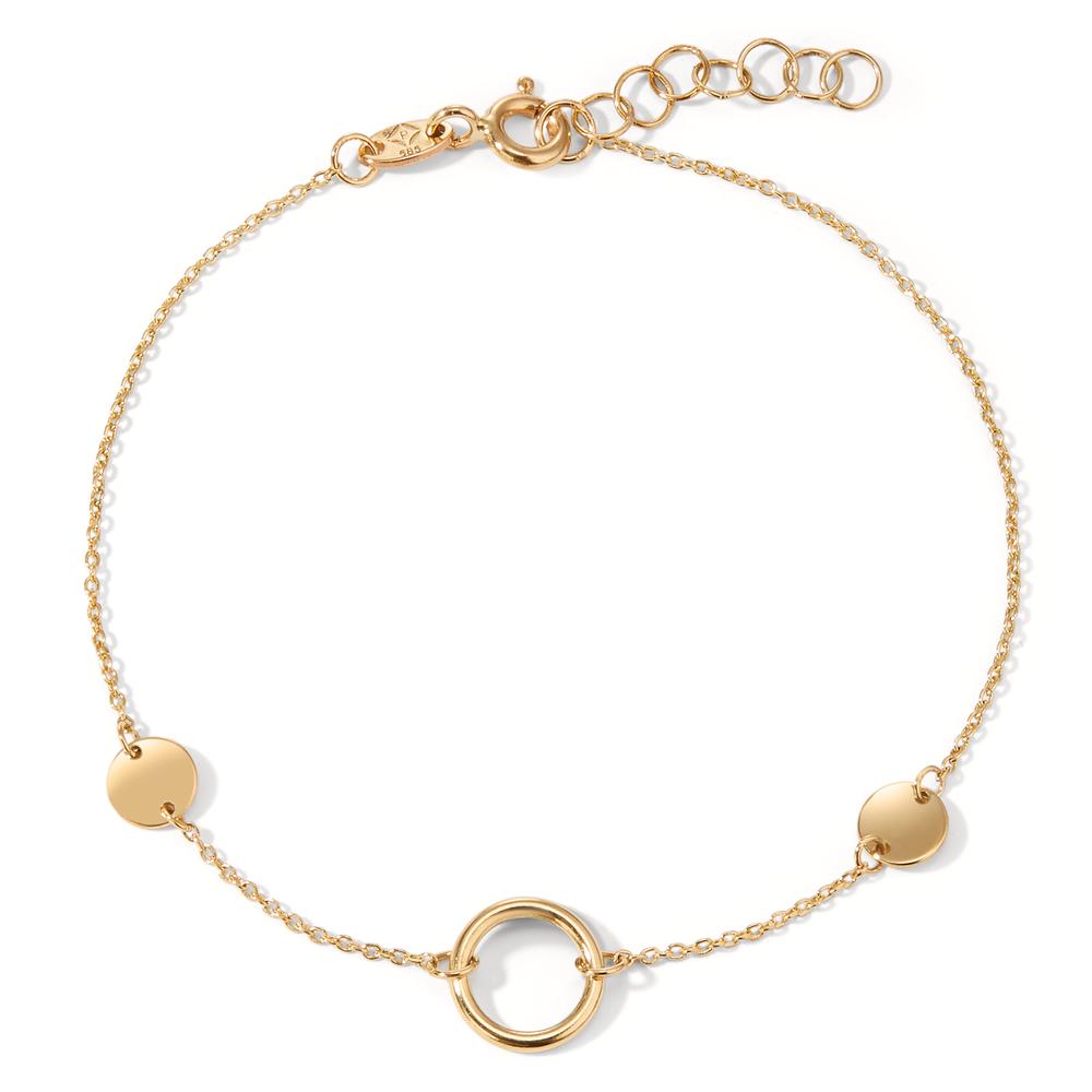 Elegantes Damen Armband aus hochwertigem 585er Gelbgold. Fein gearbeitete Gliederkette mit einem stilvollen Kreis-Element und zwei kleinen Plättchen als dezentes Highlight. Verstellbare Länge für perfekten Sitz und zeitlosen Schmuck-Genuss bei jedem Anlass.