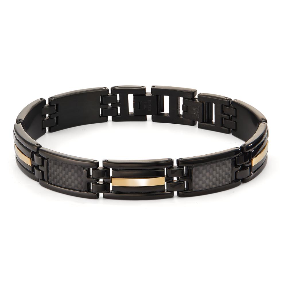 Dieses Herrenarmband aus hochwertigem Edelstahl besticht durch seine Kombination aus schwarzer Carbon-Optik und goldfarbenen Akzenten. Robust und stilvoll zugleich, bietet es einen modernen Look für jeden Anlass. Ein echtes Statement-Accessoire für Herren mit Anspruch an Design und Qualität.