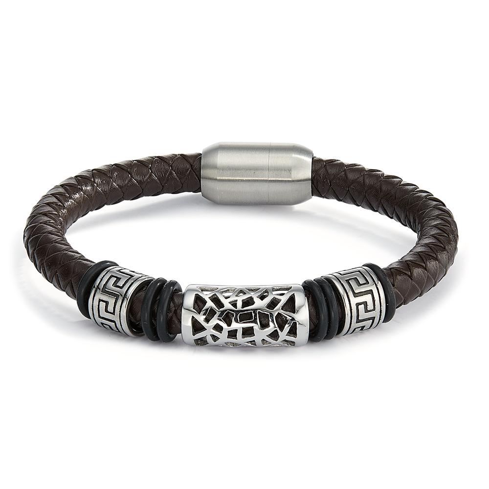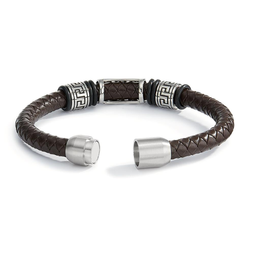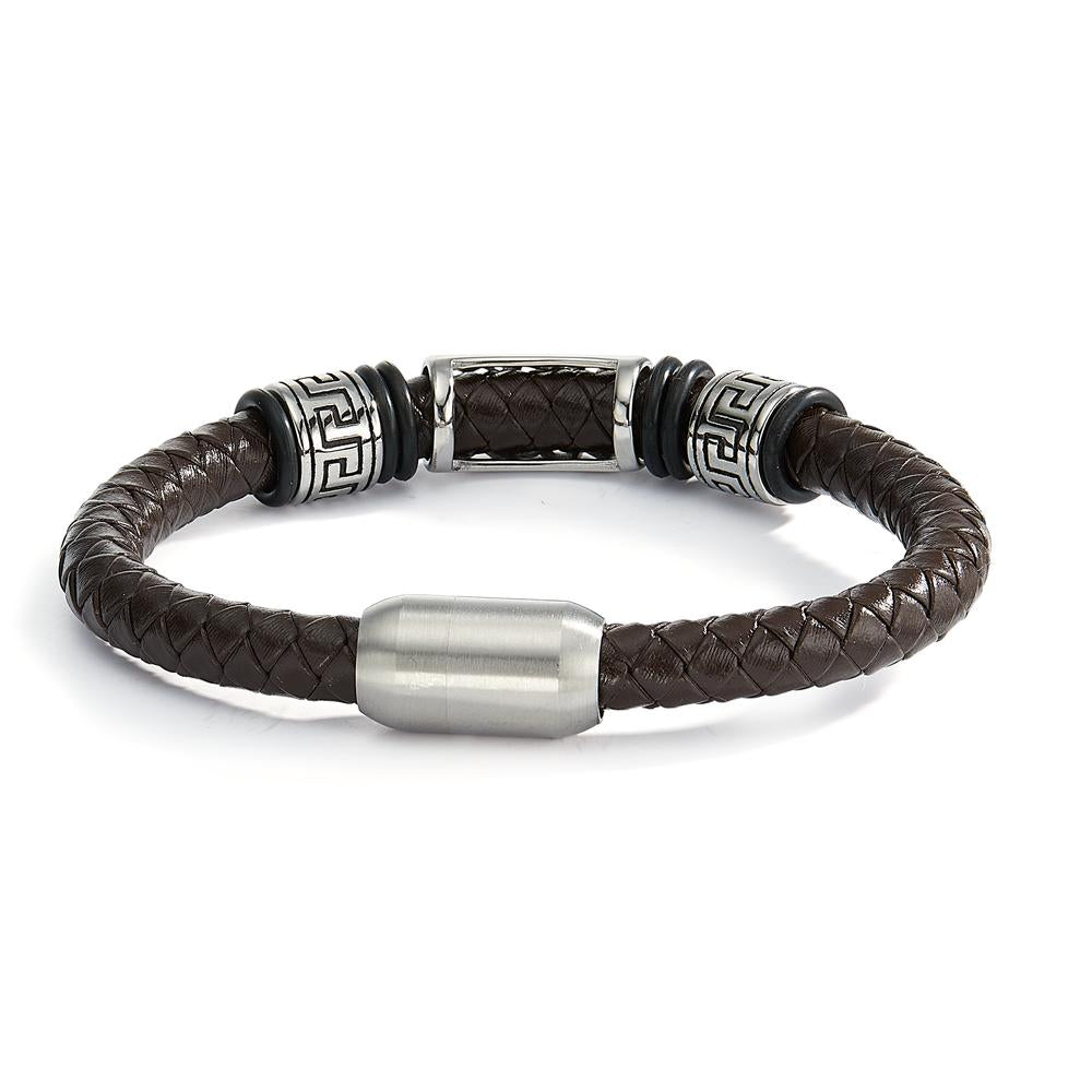 Dieses Herren-Armband vereint robustes, geflochtenes Leder mit stilvollen Edelstahl-Elementen. Die markanten Details und der sichere Magnetverschluss machen es zum perfekten Accessoire für einen maskulinen Look – zeitlos, elegant und vielseitig kombinierbar.