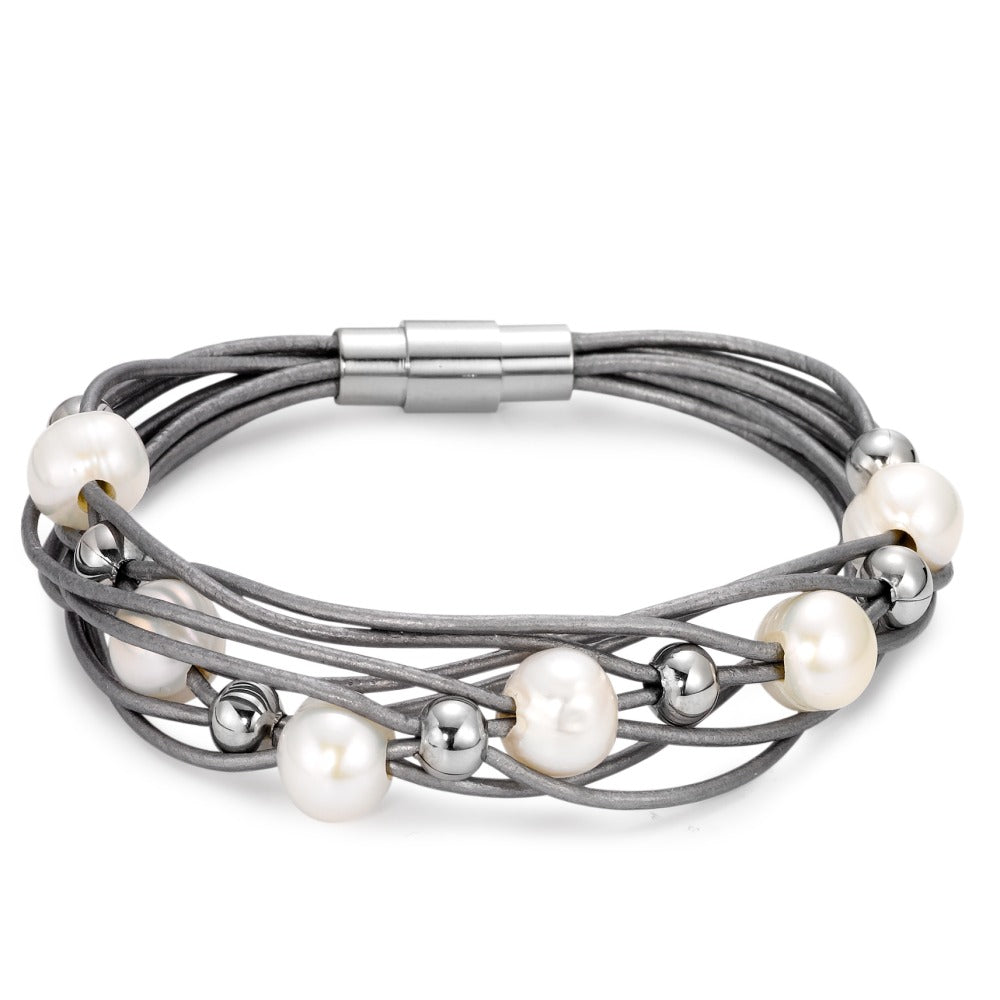 Armband Edelstahl, Leder Süsswasserzuchtperle 19 cm