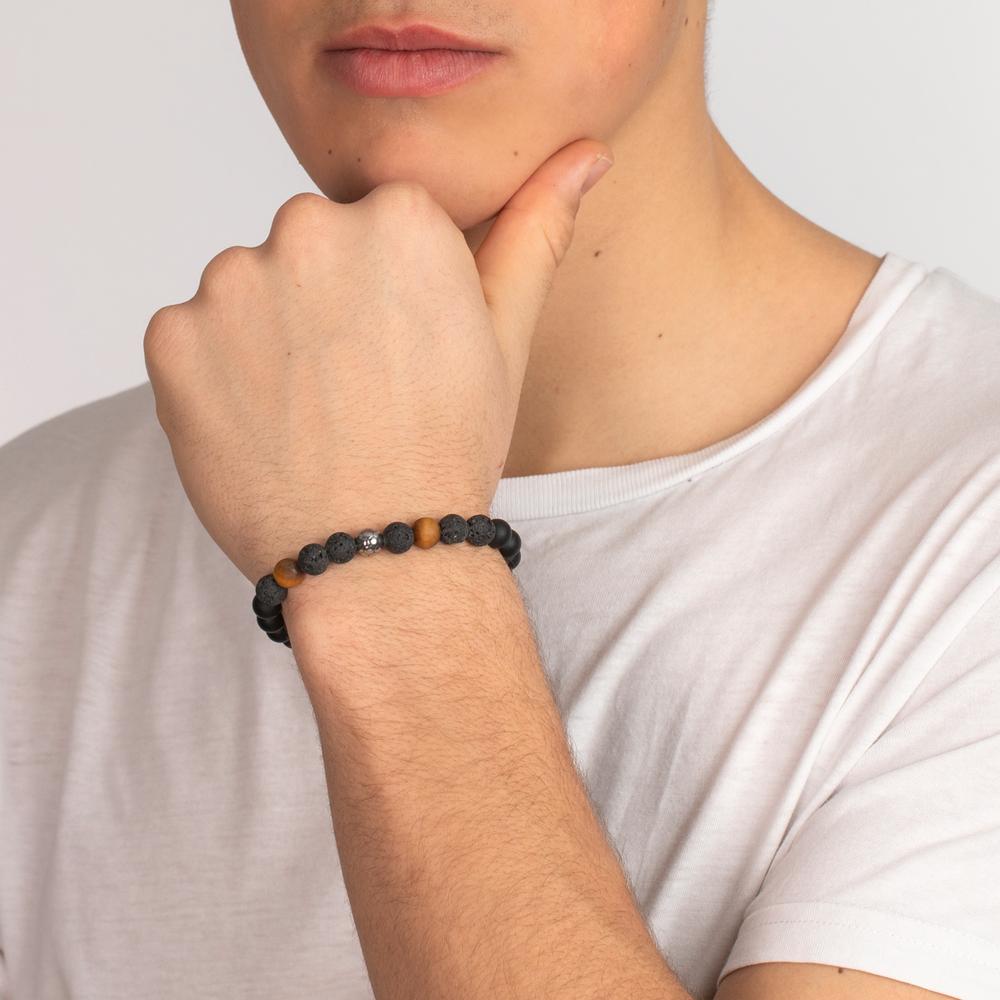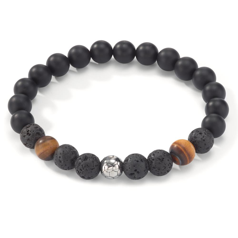 Stilvolles Herrenarmband aus elastischem Band mit matten Onyx-Perlen, edlen Lavastein-Elementen und Akzenten aus Tigerauge. Ein besonderer Edelstahl-Perlenanhänger in Form eines Fussballs macht das Design einzigartig. Perfekt für sportliche Männer mit Geschmack.