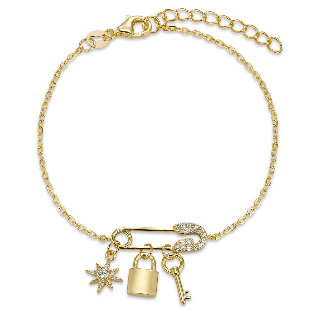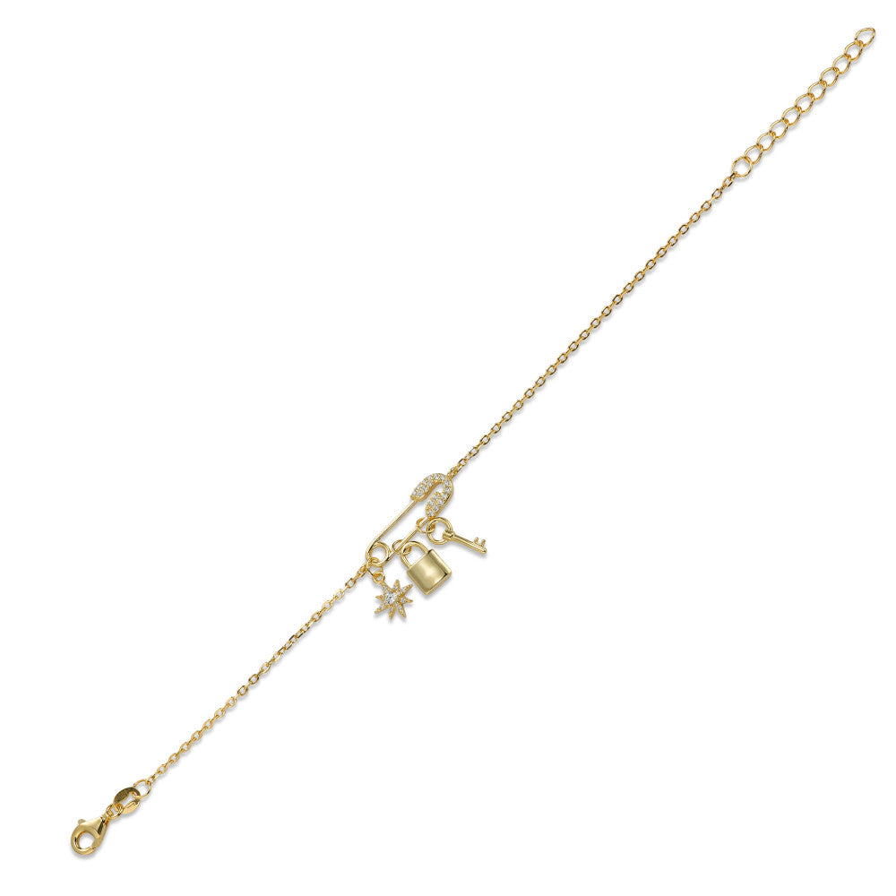 Dieses filigrane Damenarmband aus edlem Silber besticht durch funkelnde Zirkonia-Steine. Der Sicherheitsspangen-Anhänger mit Stern, Schloss und Schlüssel verleiht dem Schmuckstück einen verspielten, modernen Look – ein perfektes Accessoire für jeden Anlass.
