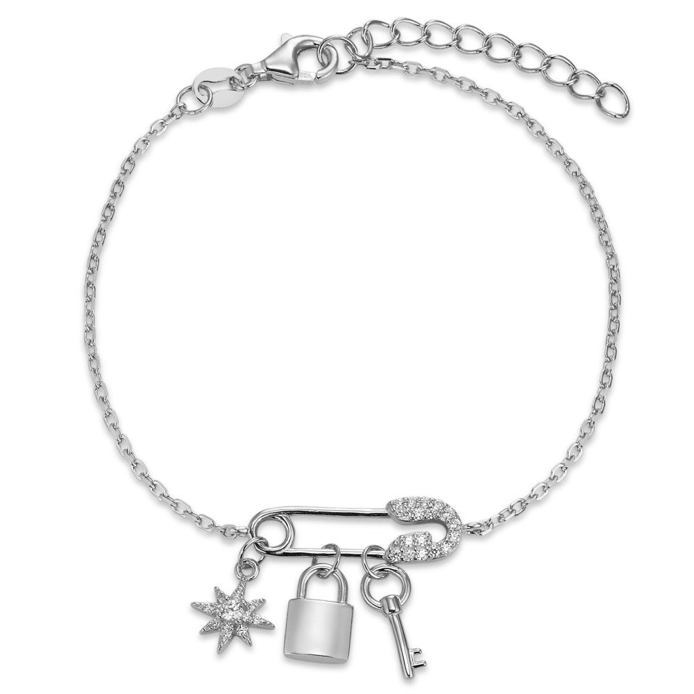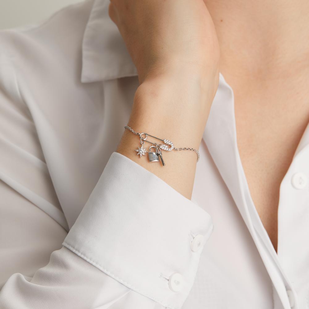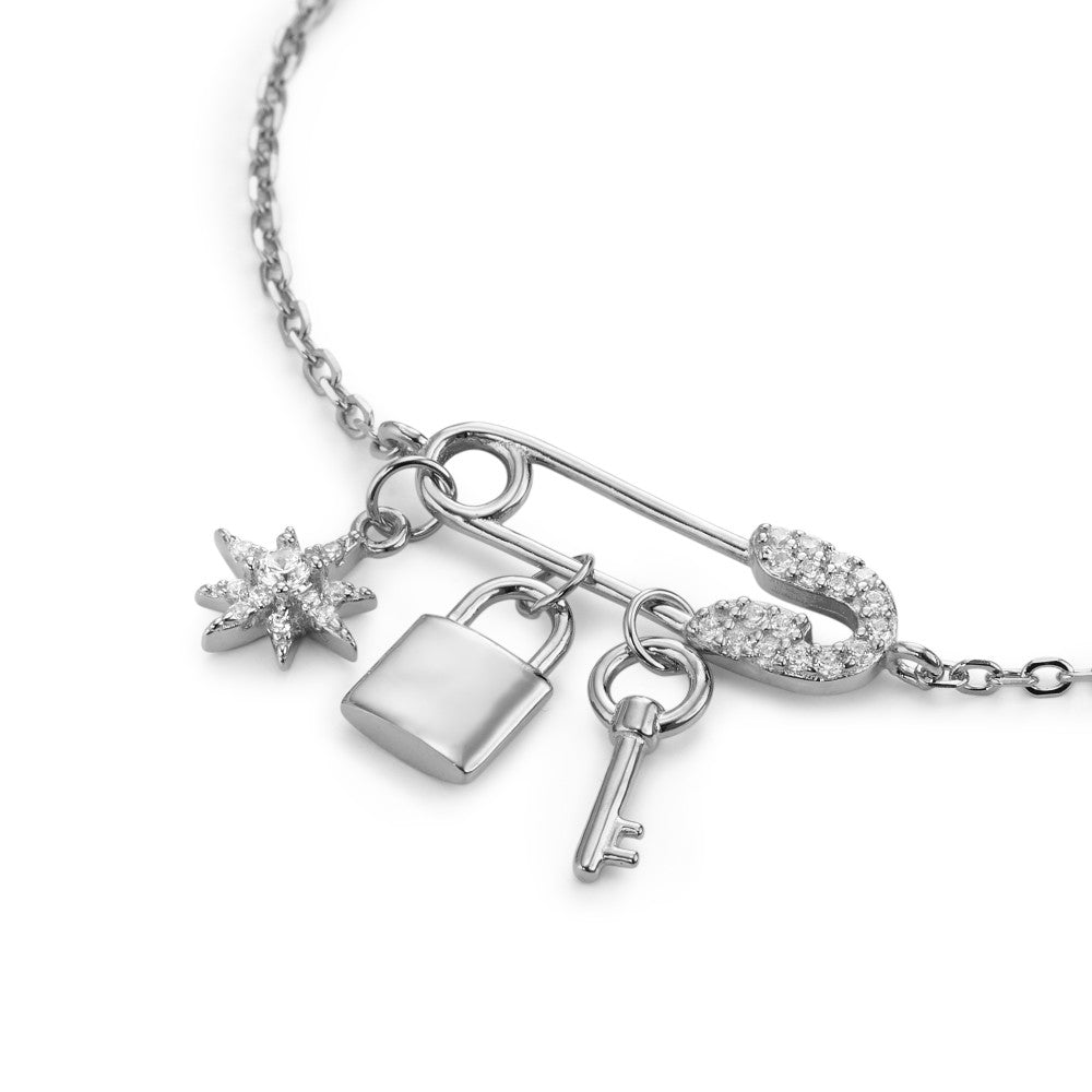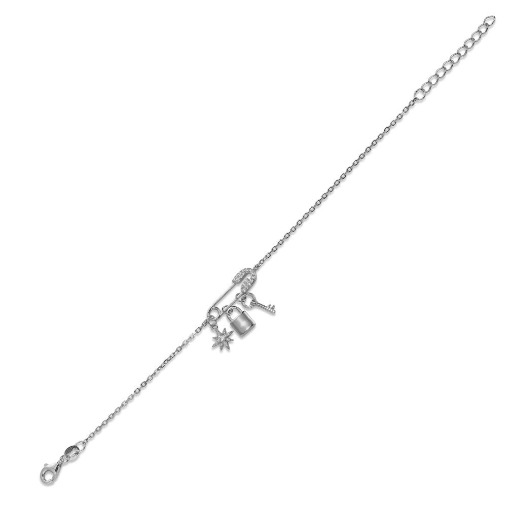 Elegantes Damen-Armband aus hochwertigem Silber mit funkelnden Zirkonia-Steinen. Das filigrane Design mit Sicherheitsnadel-Anhänger, Stern, Schloss und Schlüssel verleiht jedem Outfit einen modernen und charmanten Look. Verstellbare Länge für perfekten Sitz.