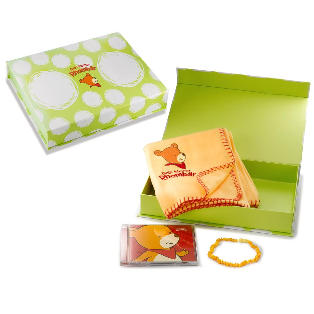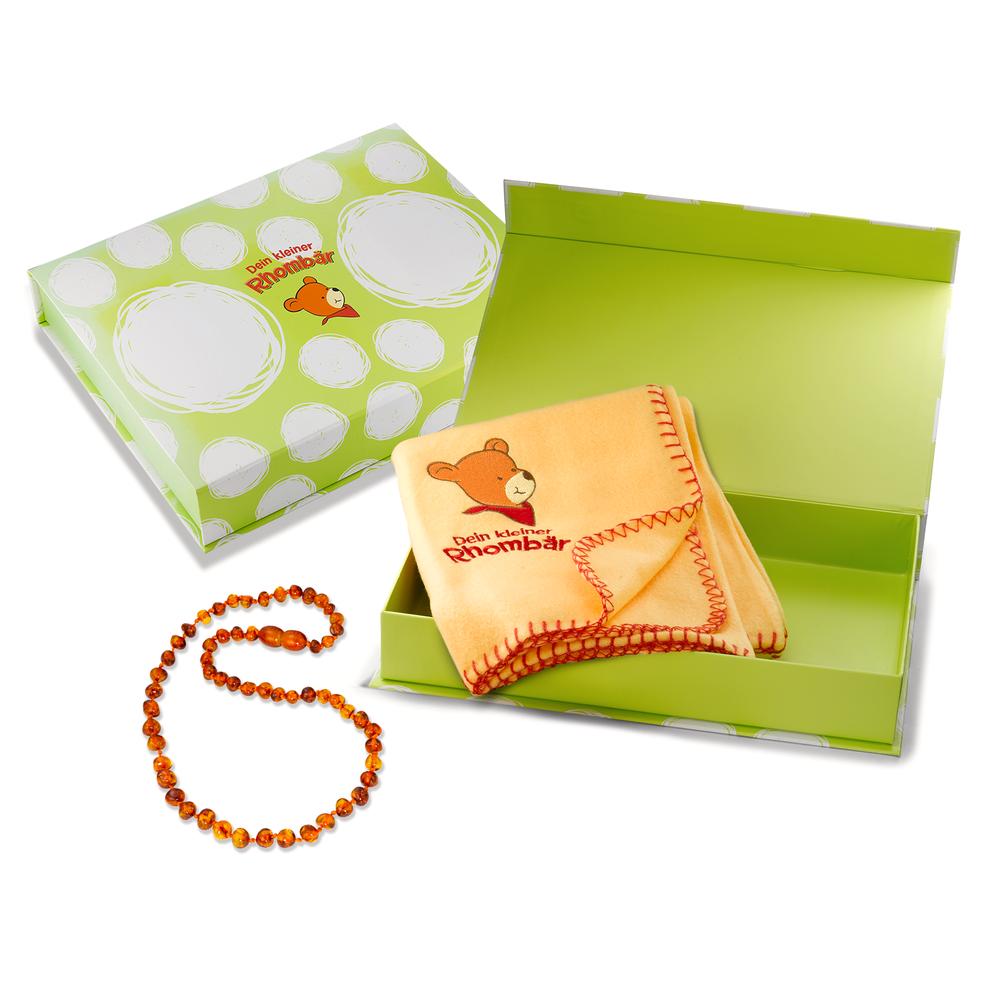 Das Baby Set „Dein kleiner Rhombär“ besteht aus einer kuscheligen Fleecedecke, einem hübschen Bernstein-Armband und einer CD mit beruhigenden Liedern. Perfekt als liebevolles Geschenk für Neugeborene – praktisch und schön verpackt in einer bunten Geschenkbox.