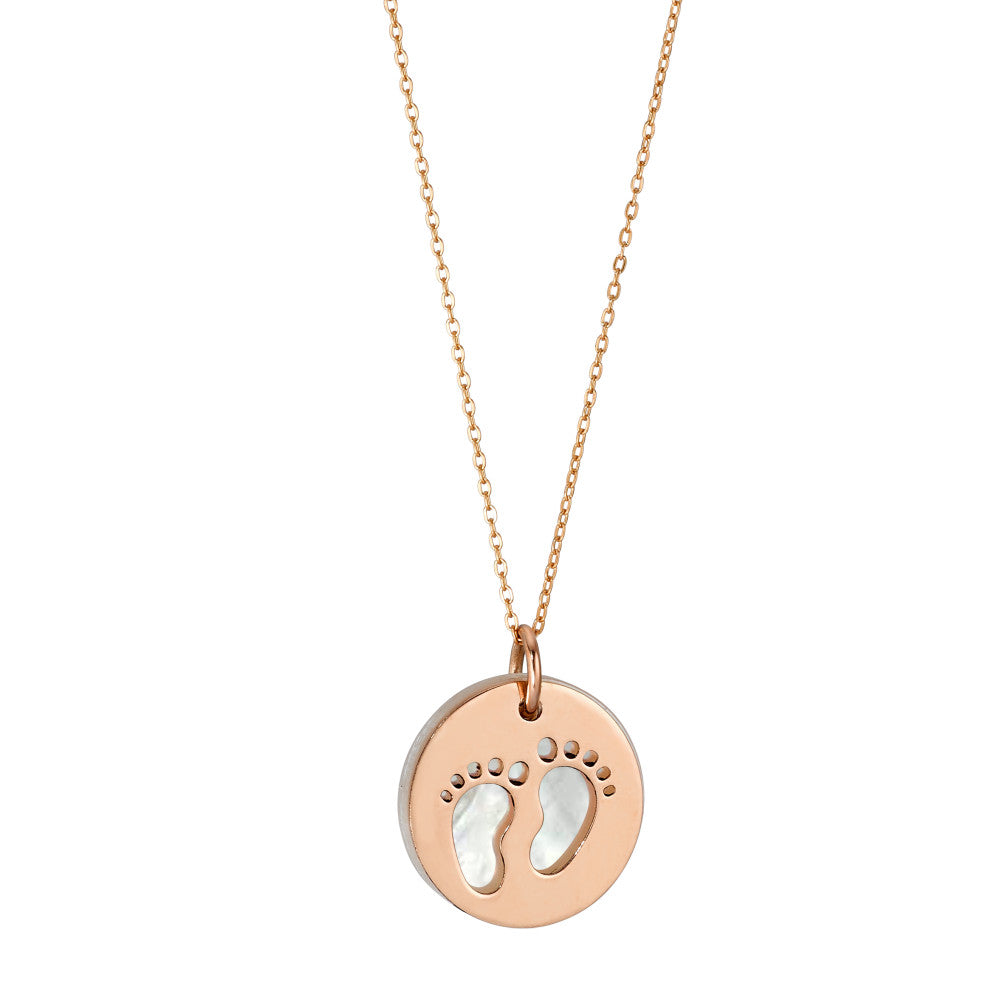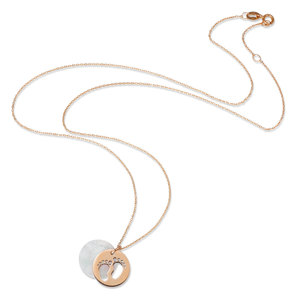 Dieses elegante Damen-Collier aus 585er Rotgold besticht durch einen runden Anhänger mit zarten Kinderfüssen, die mit funkelndem Perlmutt hinterlegt sind. Ein zeitloses Schmuckstück voller Liebe und Stil, ideal für jeden Anlass.