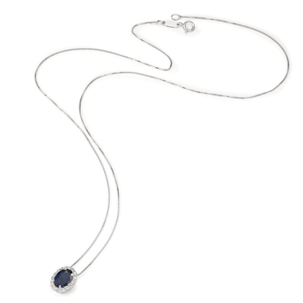 Elegantes Damen-Collier aus 750er Weissgold mit einem facettierten, ovalen Zirkonia in tiefblauer Farbe. Umgeben von funkelnden weissen Zirkonia, die dem Schmuckstück ein strahlendes, zeitloses Design verleihen. Perfekt für besondere Anlässe oder als stilvolles Accessoire im Alltag.