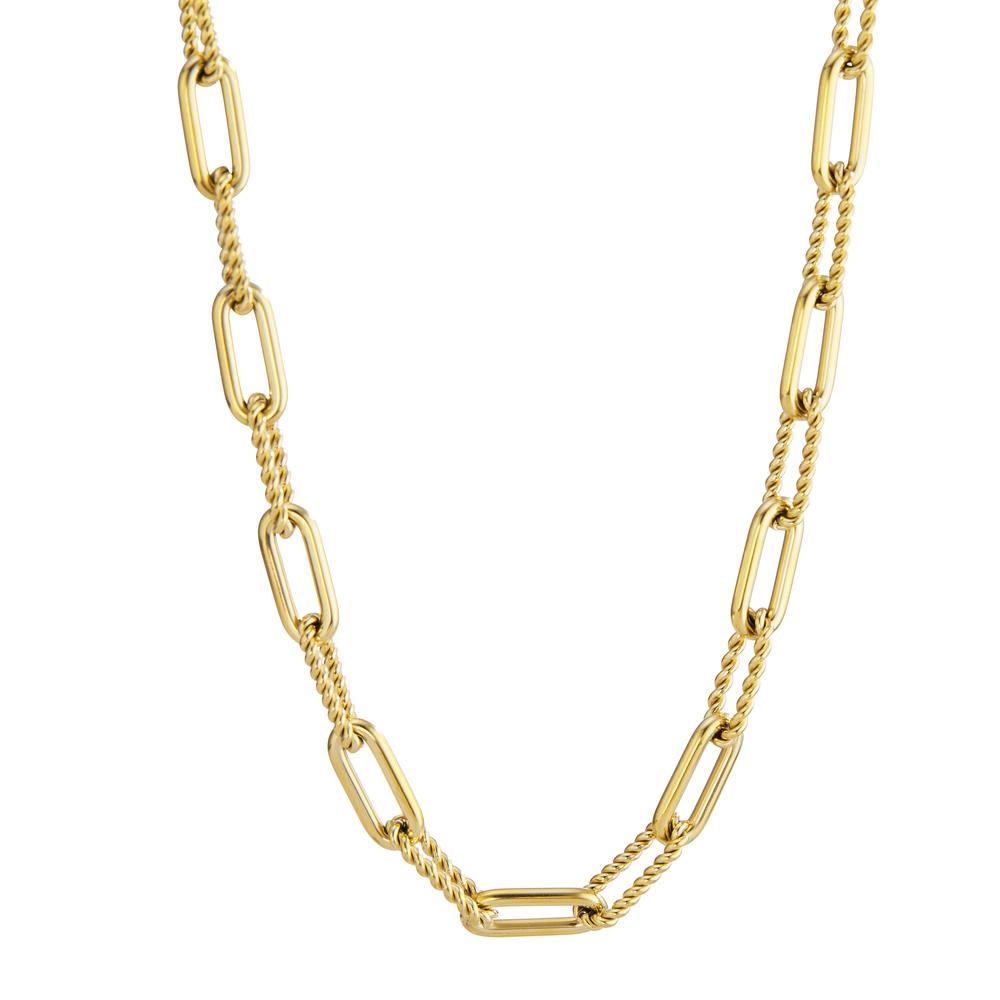 Dieses Damen-Collier aus hochwertigem Edelstahl besticht durch sein modernes Design mit elegant verdrehten und rechteckigen Gliedern. Die goldfarbene Oberfläche verleiht jedem Outfit einen stilvollen Akzent. Langlebig, robust und perfekt für jeden Anlass.