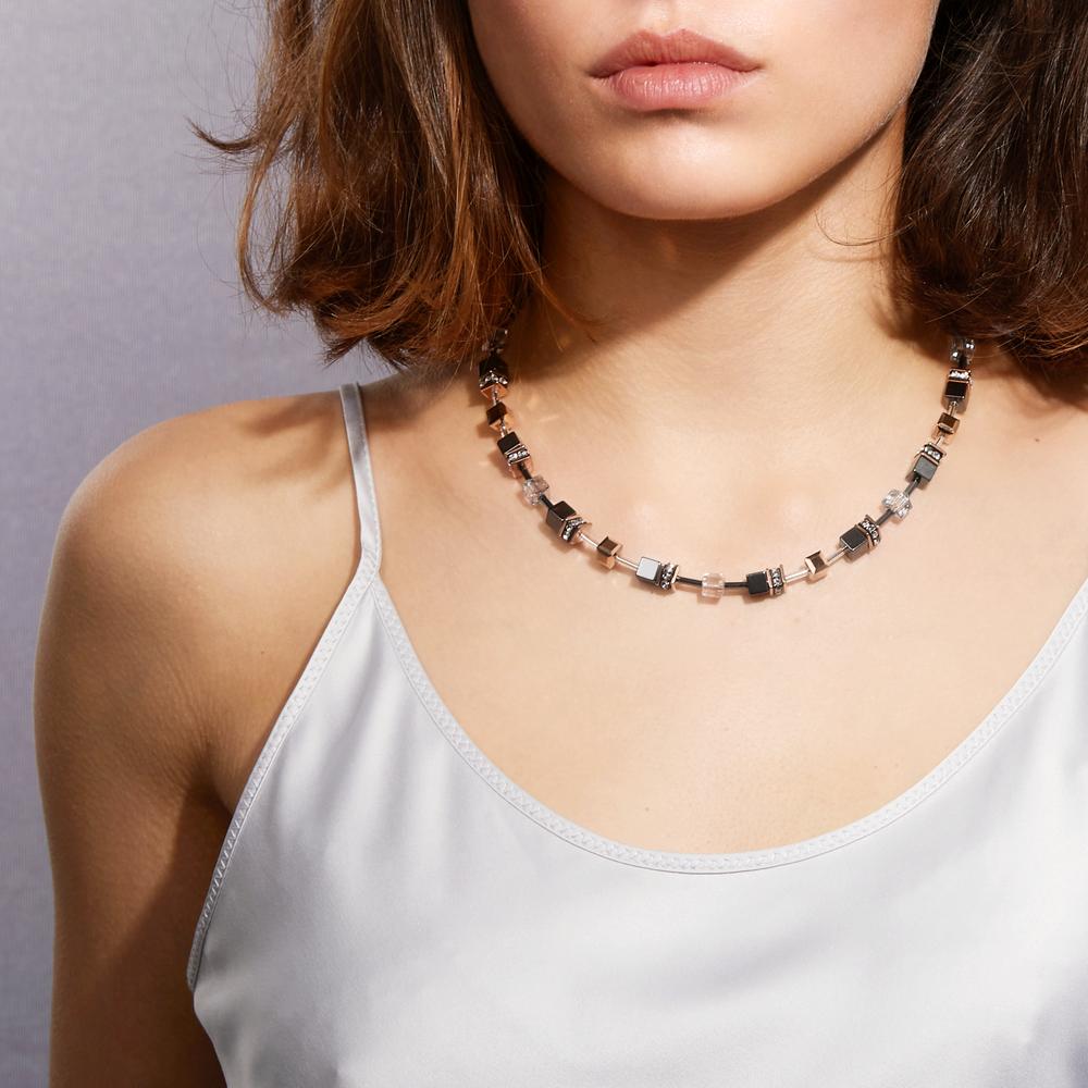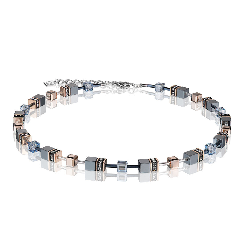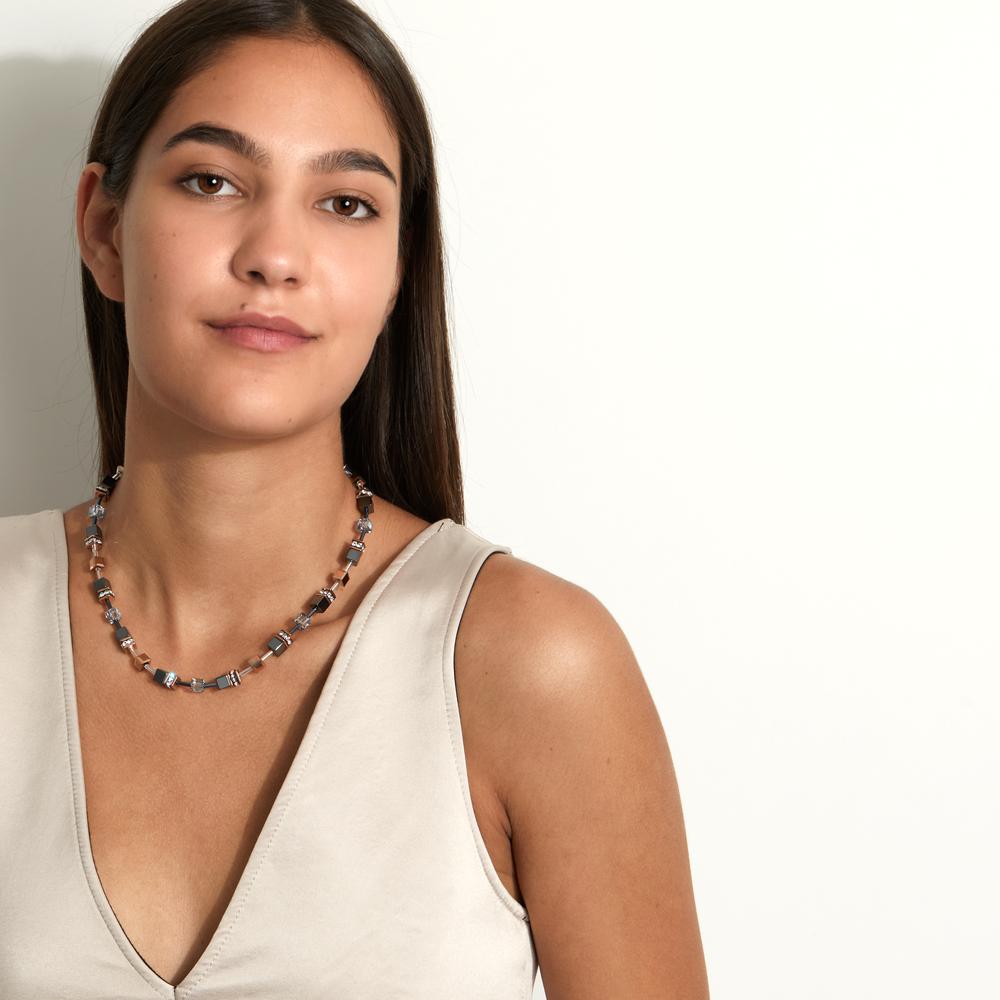Elegantes Damen-Collier aus hochwertigem Edelstahl, verziert mit stilvollen kubischen Elementen in mehreren Farben. Das moderne Design mit glänzenden Details macht es zum perfekten Accessoire für jeden Anlass. Verstellbare Länge für optimalen Tragekomfort.