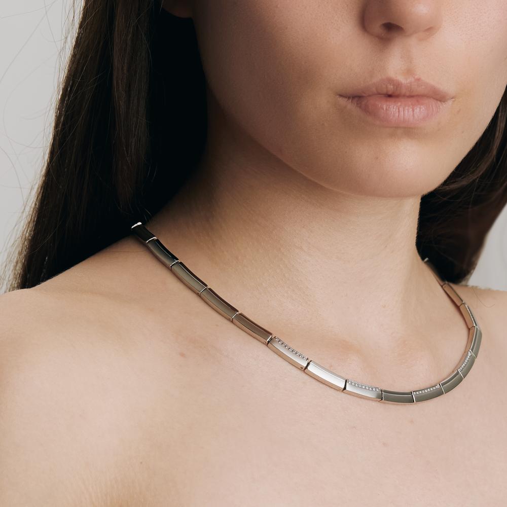 Elegantes Damen-Collier aus hochwertigem Edelstahl mit funkelnden Zirkonia-Steinen veredelt. Das zeitlose Design aus rechteckigen Gliedern sorgt für einen modernen Look und passt perfekt zu jedem Anlass. Ein Schmuckstück für stilbewusste Frauen, das Glanz und Eleganz ausstrahlt.
