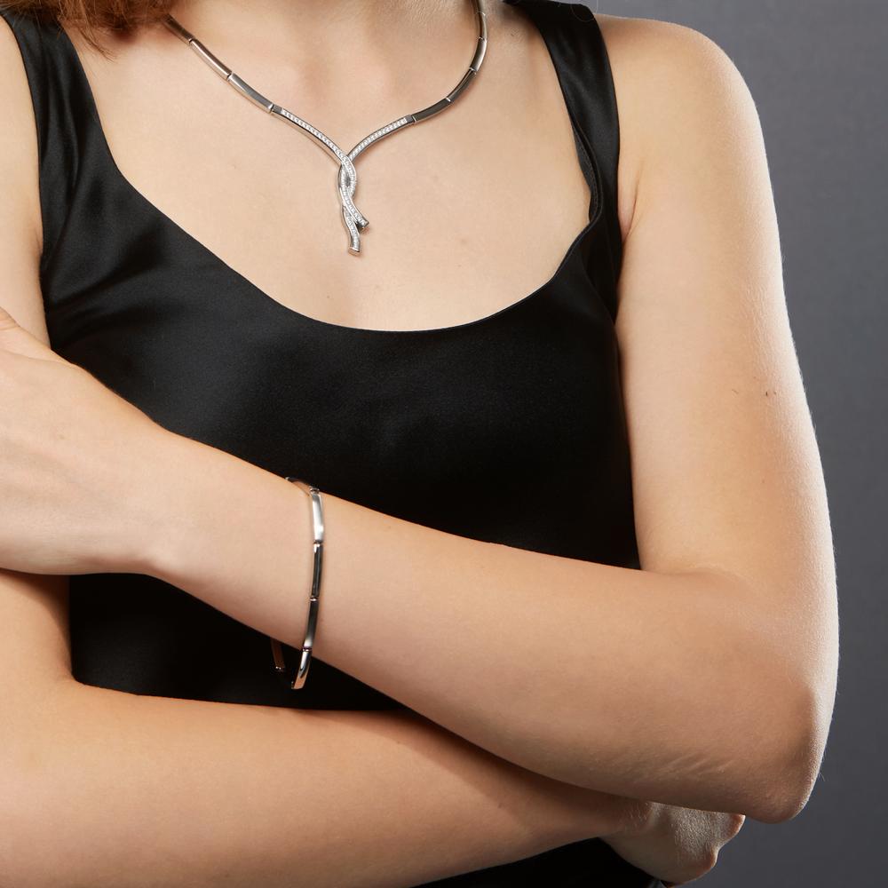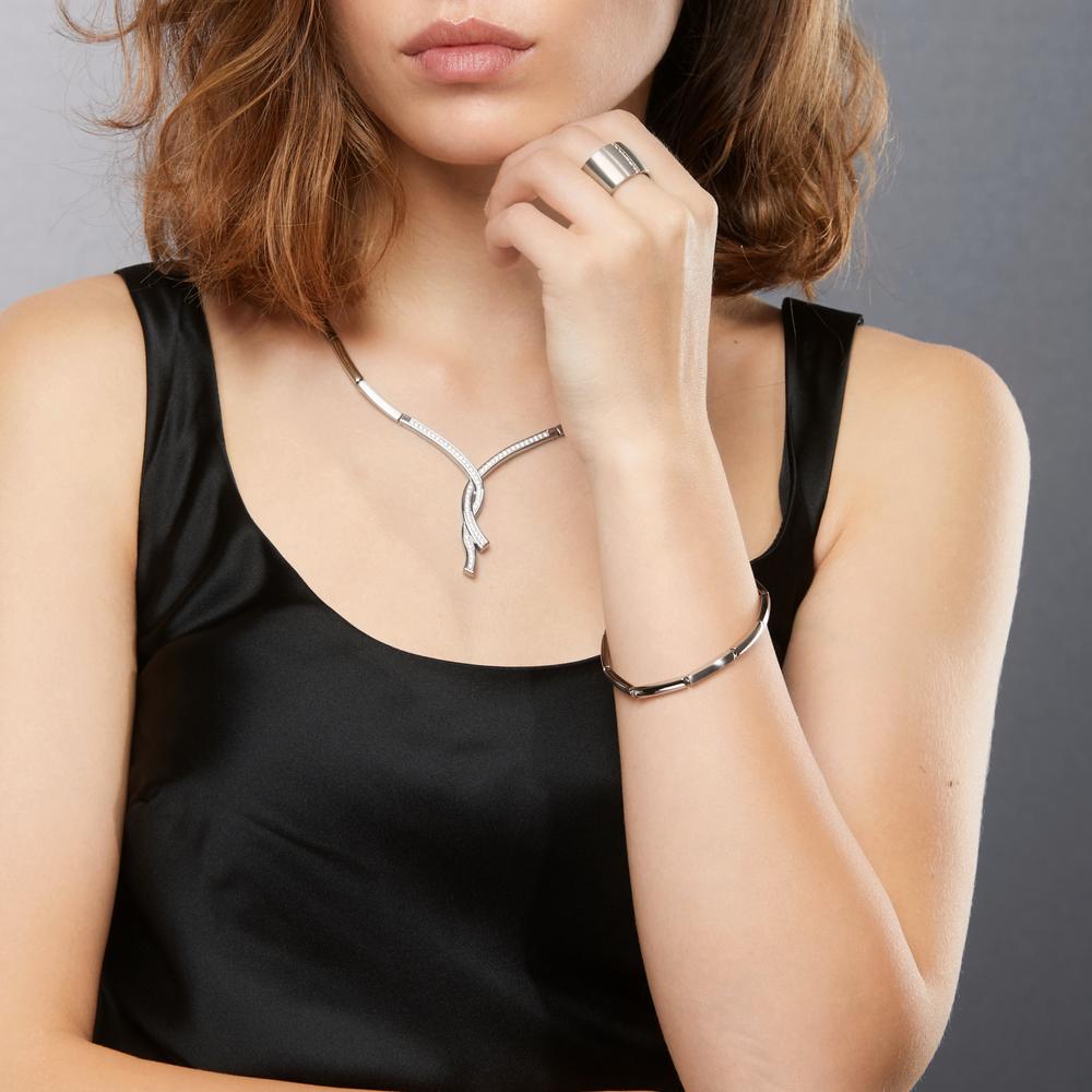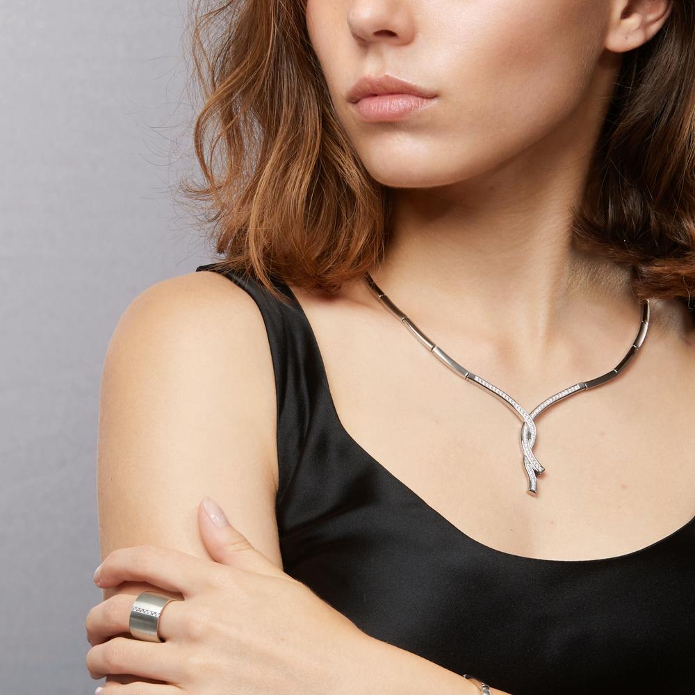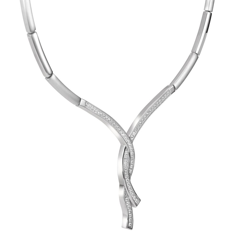 Elegantes Damen-Collier aus hochwertigem, langlebigem Edelstahl. Das stilvolle Design wird durch funkelnde Zirkonia-Steine veredelt, die dem Schmuckstück einen strahlenden Glanz verleihen. Perfekt für besondere Anlässe oder als zeitloses Accessoire im Alltag.