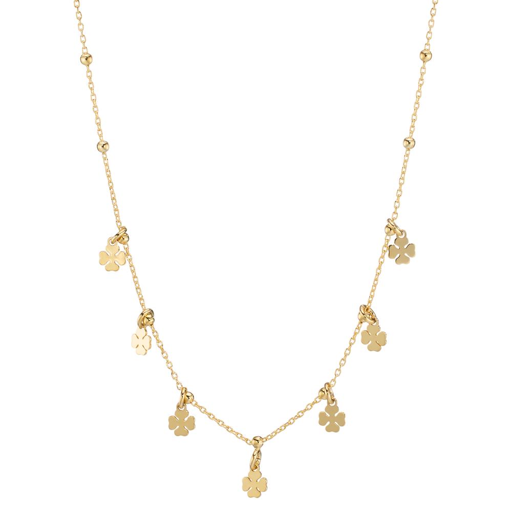 Elegantes Damen-Collier aus hochwertigem Silber mit goldfarbener Vergoldung. Die zarte Kette ist mit mehreren kleinen Kleeblatt-Anhängern verziert, die Glück und Stil symbolisieren. Ein perfektes Accessoire für jeden Anlass, das Leichtigkeit und Charme verleiht.