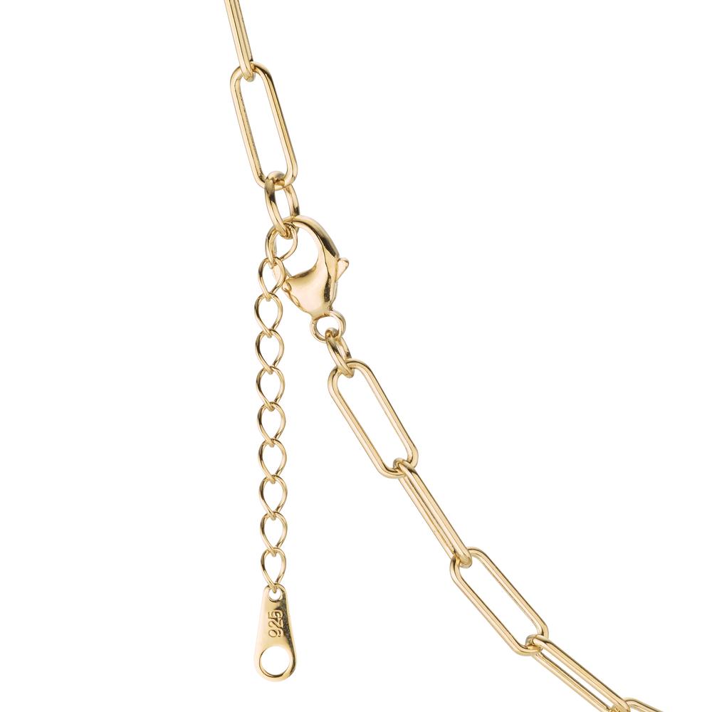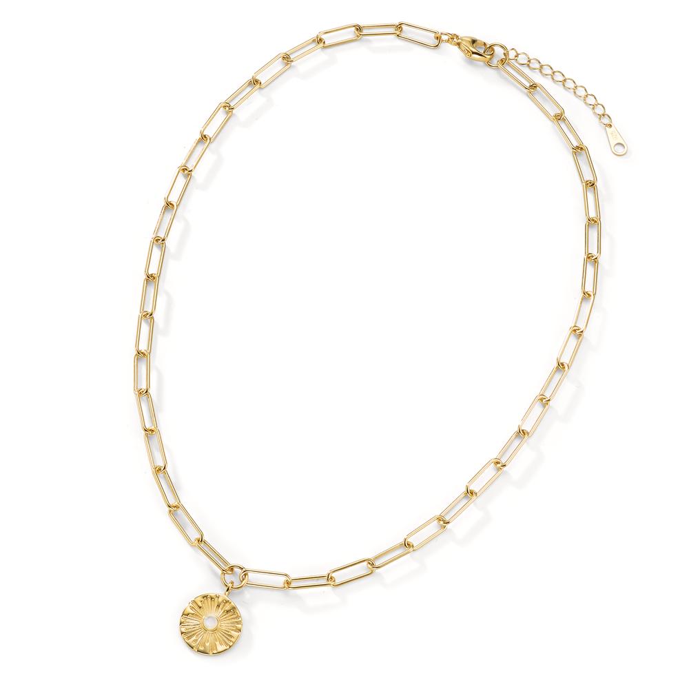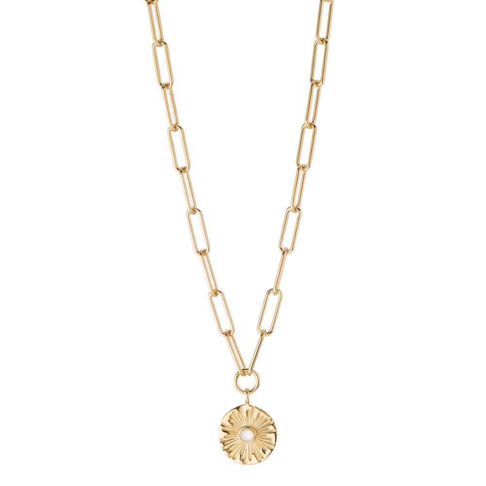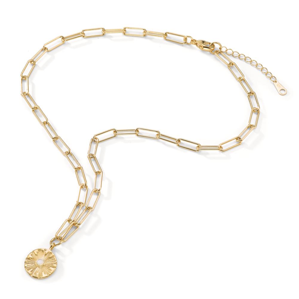 Elegantes Damen-Collier aus feinem Silber mit goldfarbener Beschichtung. Die auffällige Kettengliederung wird durch einen runden Anhänger mit schimmerndem Perlmutt in der Mitte stilvoll ergänzt. Ein modisches Accessoire für jeden Anlass.