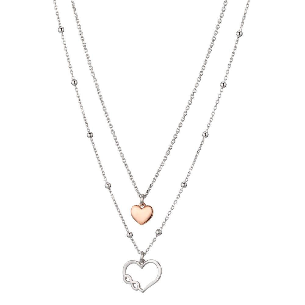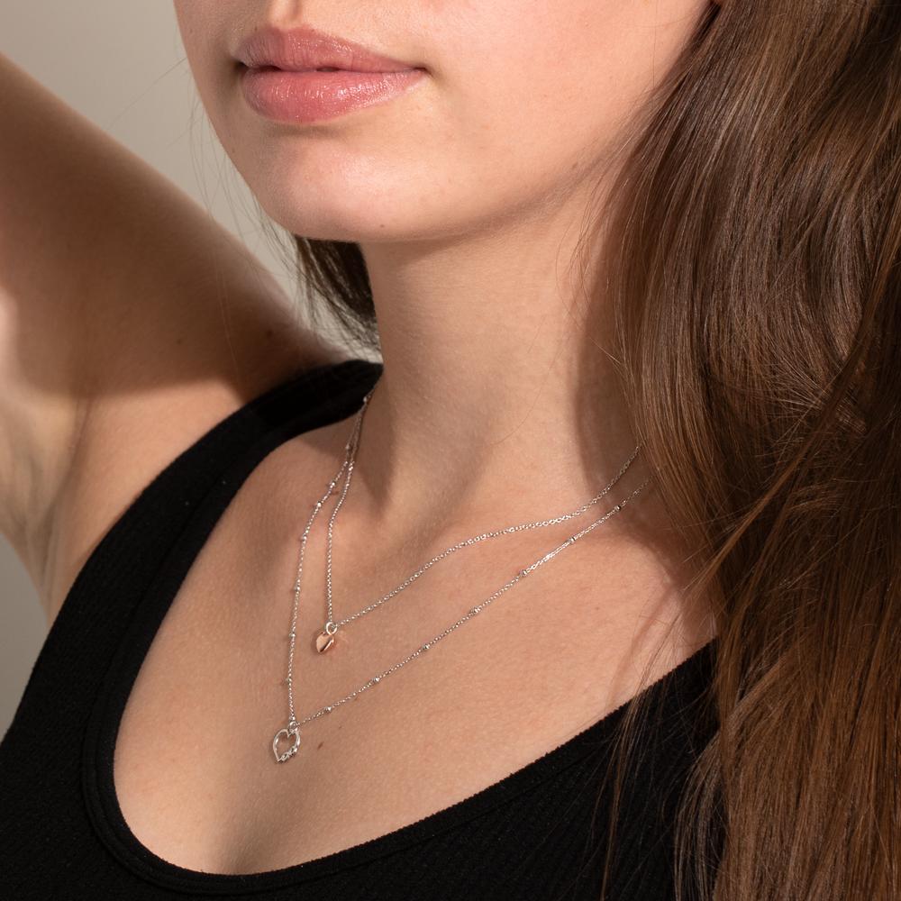 Elegantes Damen Collier aus Silber mit zwei zarten Anhängern in Herzform – eines rosévergoldet, das andere filigran offen gestaltet. Die feine Kette mit kleinen Silberperlen setzt feminine Akzente und ist ideal für jeden Anlass. Ein zeitloses Schmuckstück voller Charme.